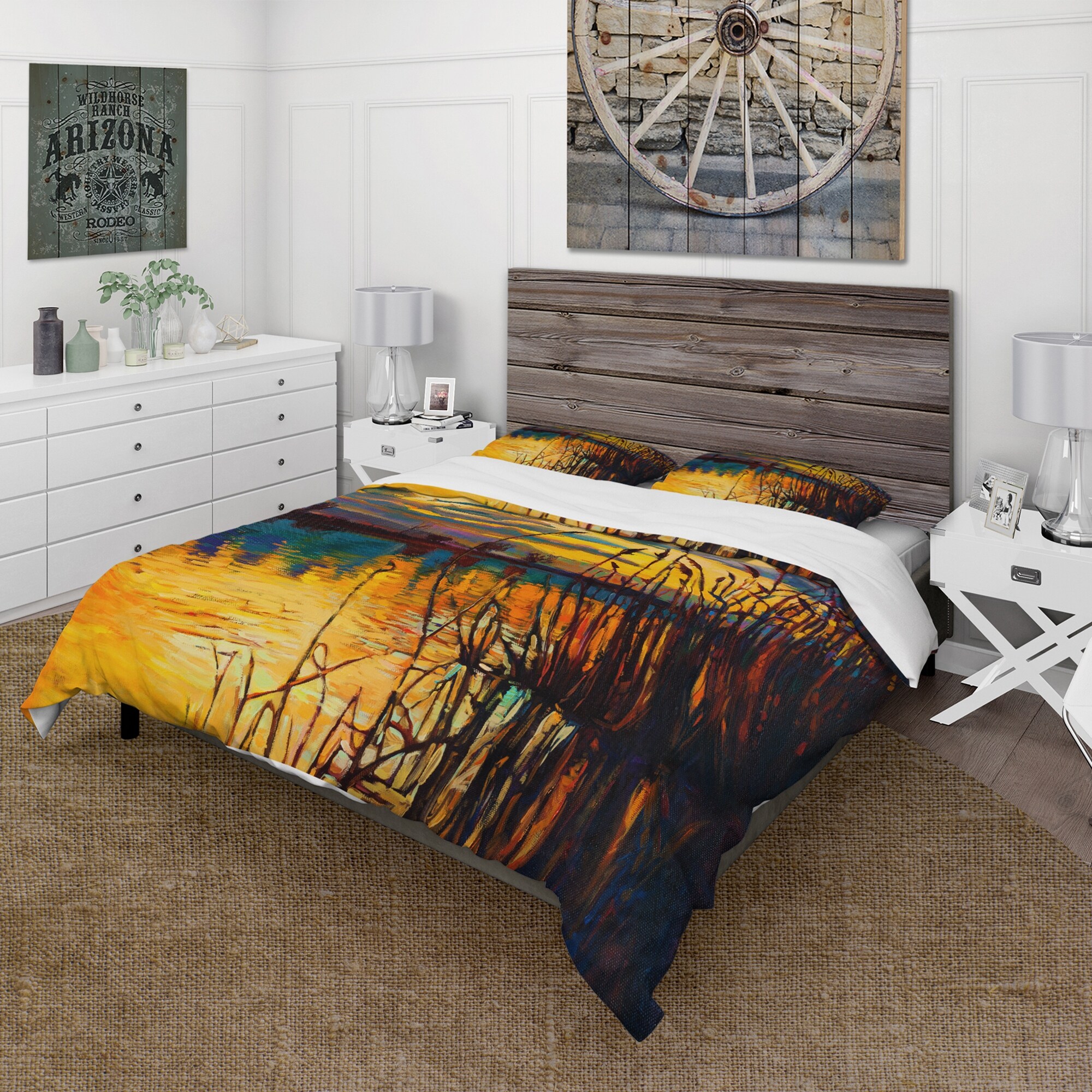 Designart 'Yellow Sunset Through the High Grass By the Lake' Nautical & Coastal Duvet Cover Set