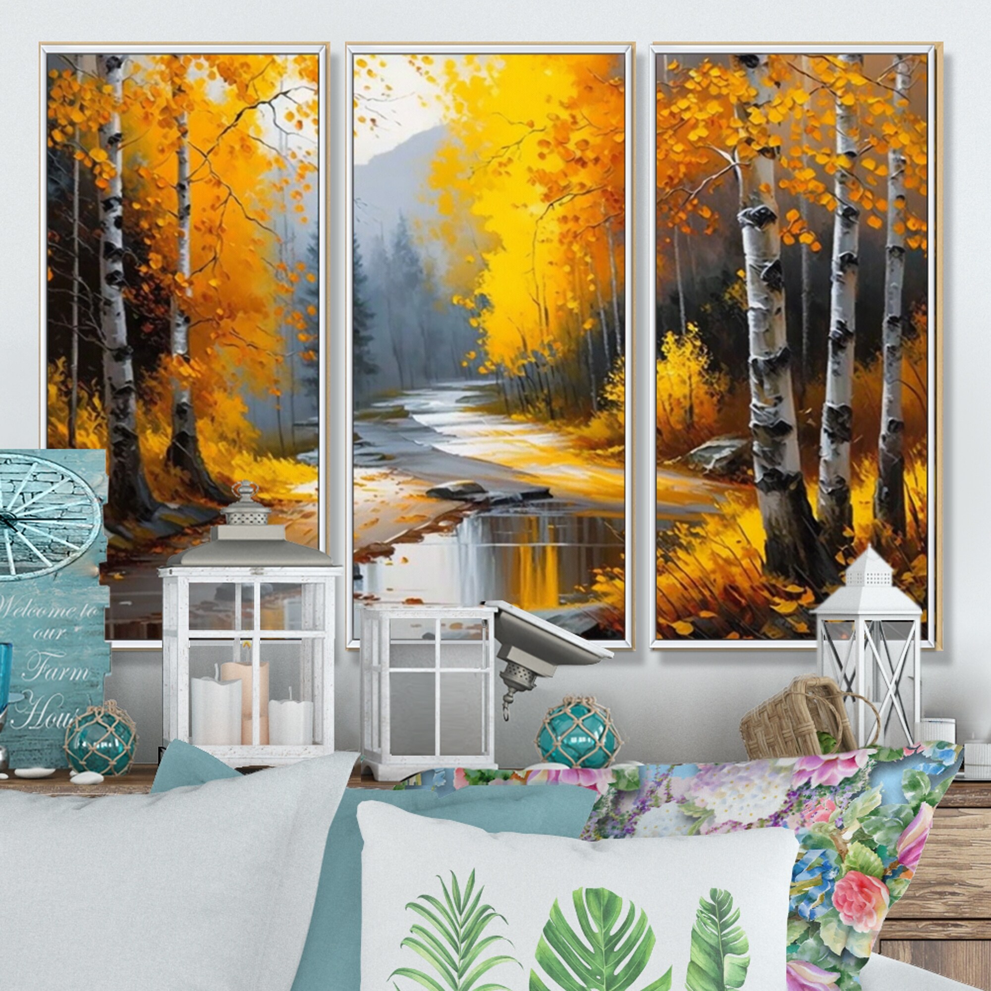Designart "Path Into the Yellow Forest II" Landscape Forest River Framed Canvas Art Print - 3 Panels