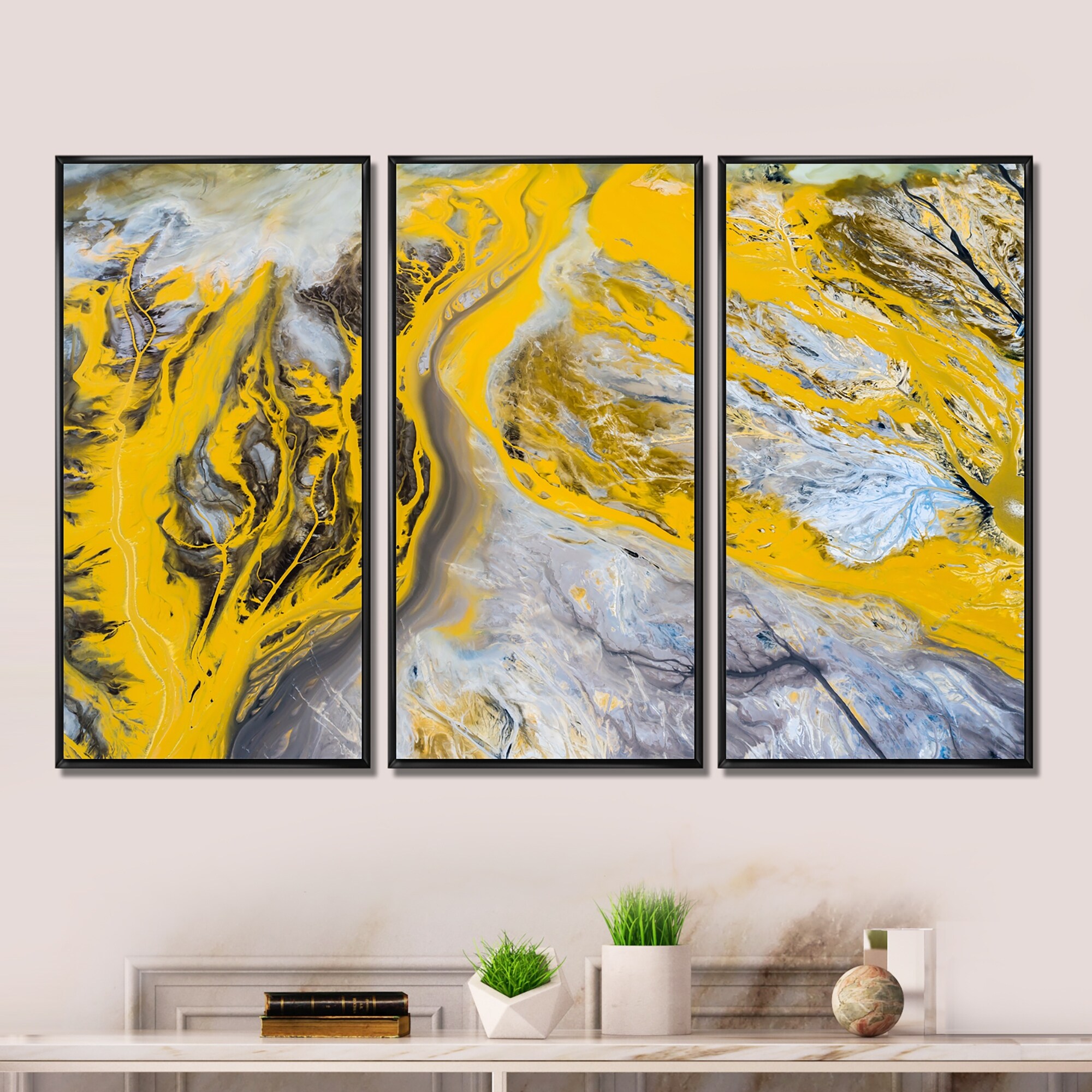 Designart "Yellow And Black Liquid Art Universe" Modern Framed Artwork Set of 3 - 4 Colors of Frames