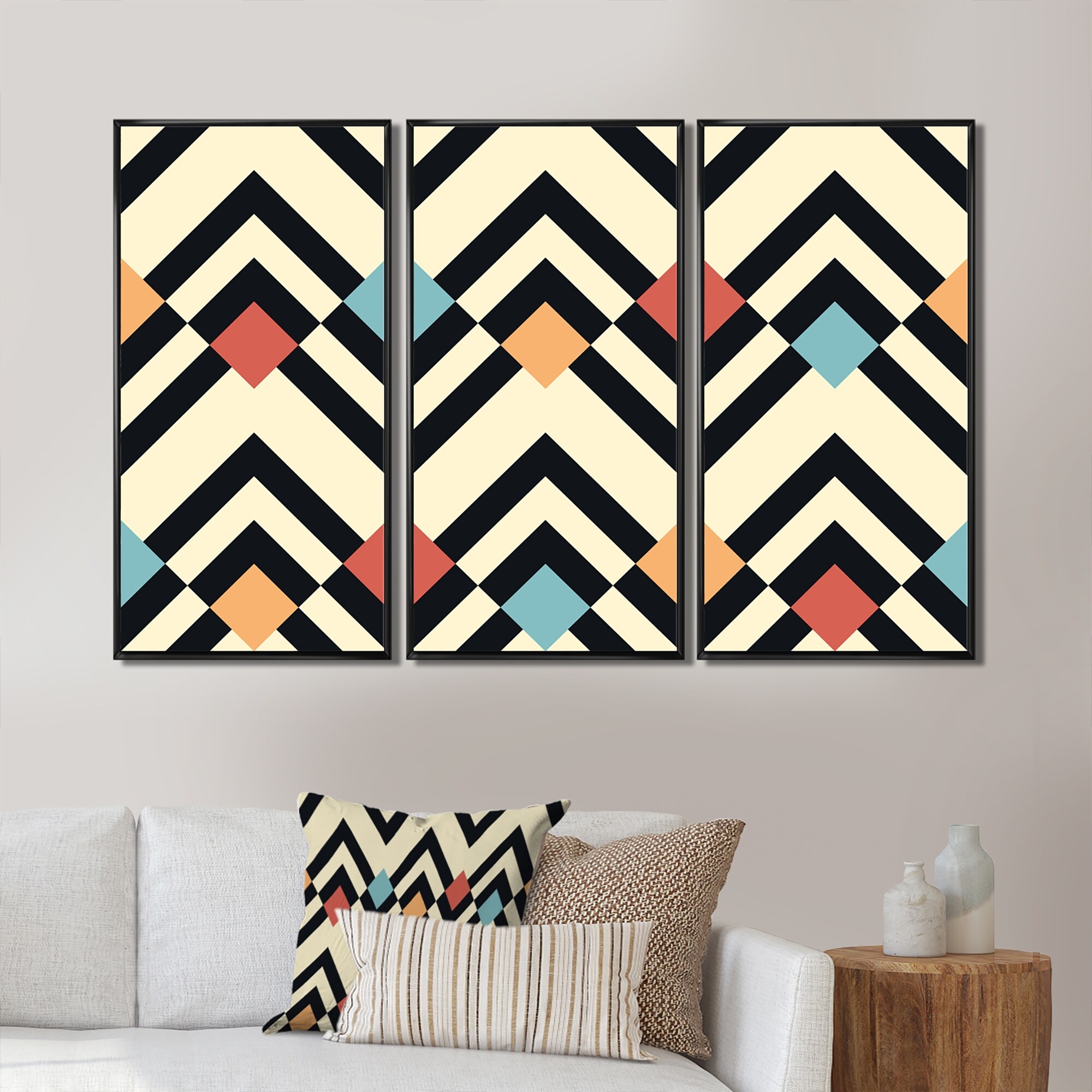Designart "Red Blue, Yellow Diamonds on Triangular Shapes I" Patterned Framed Art Set of 3 - 4 Colors of Frames