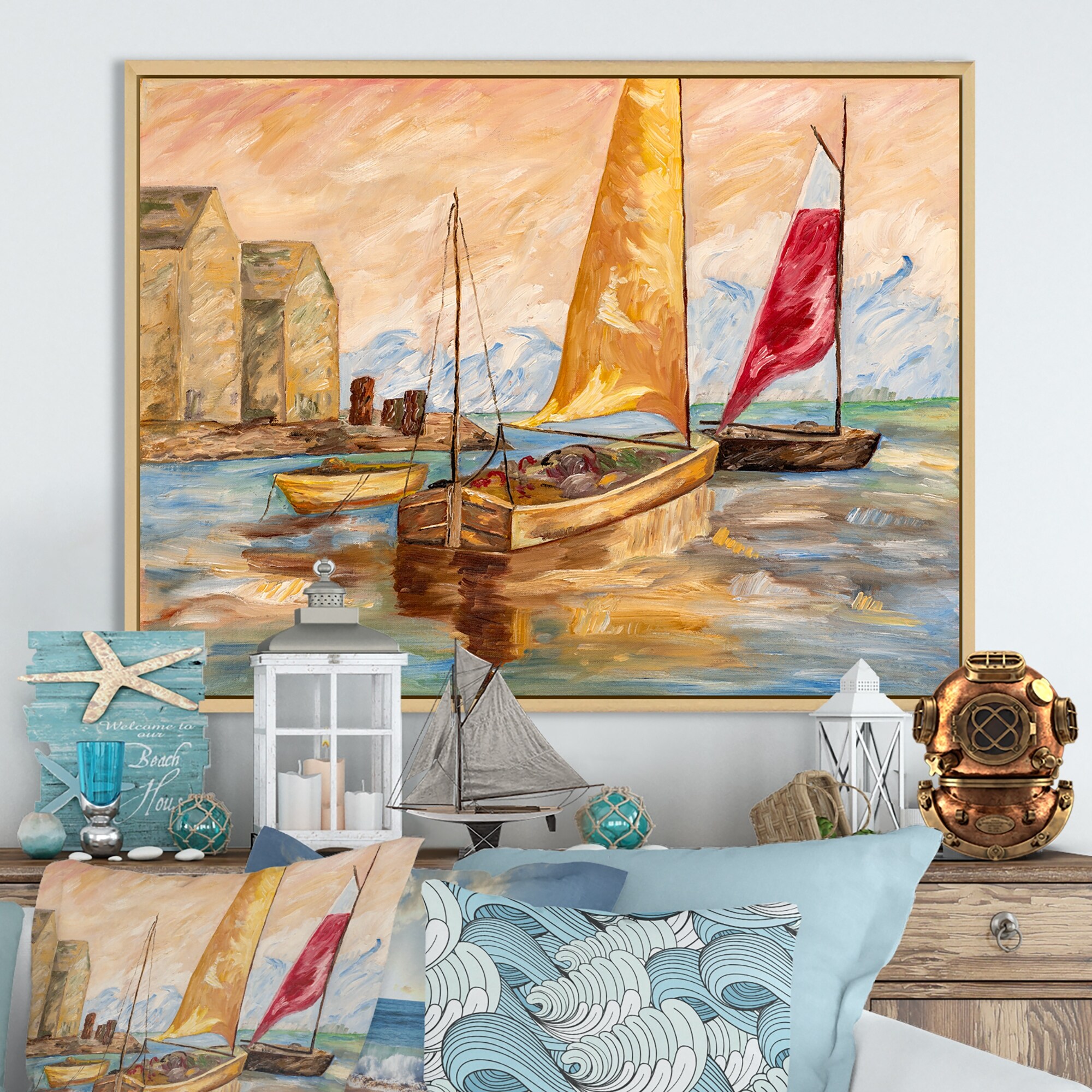 Designart "Yellow And Red Sailboats in the Harbor" Nautical & Coastal Framed Canvas Wall Art