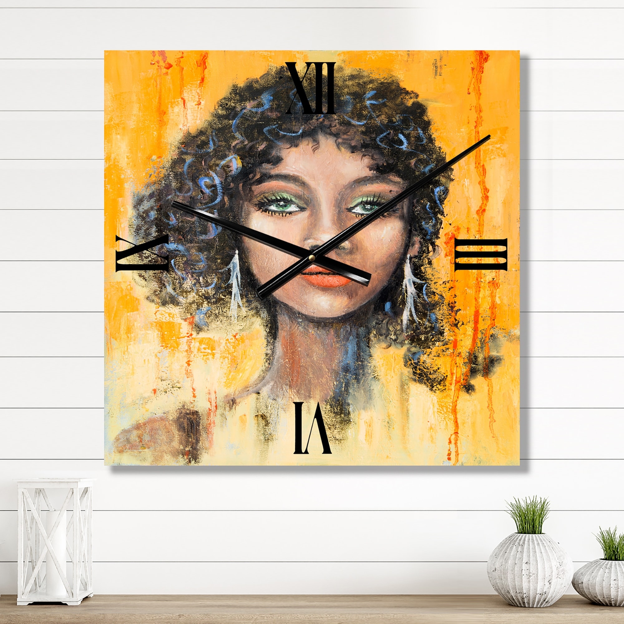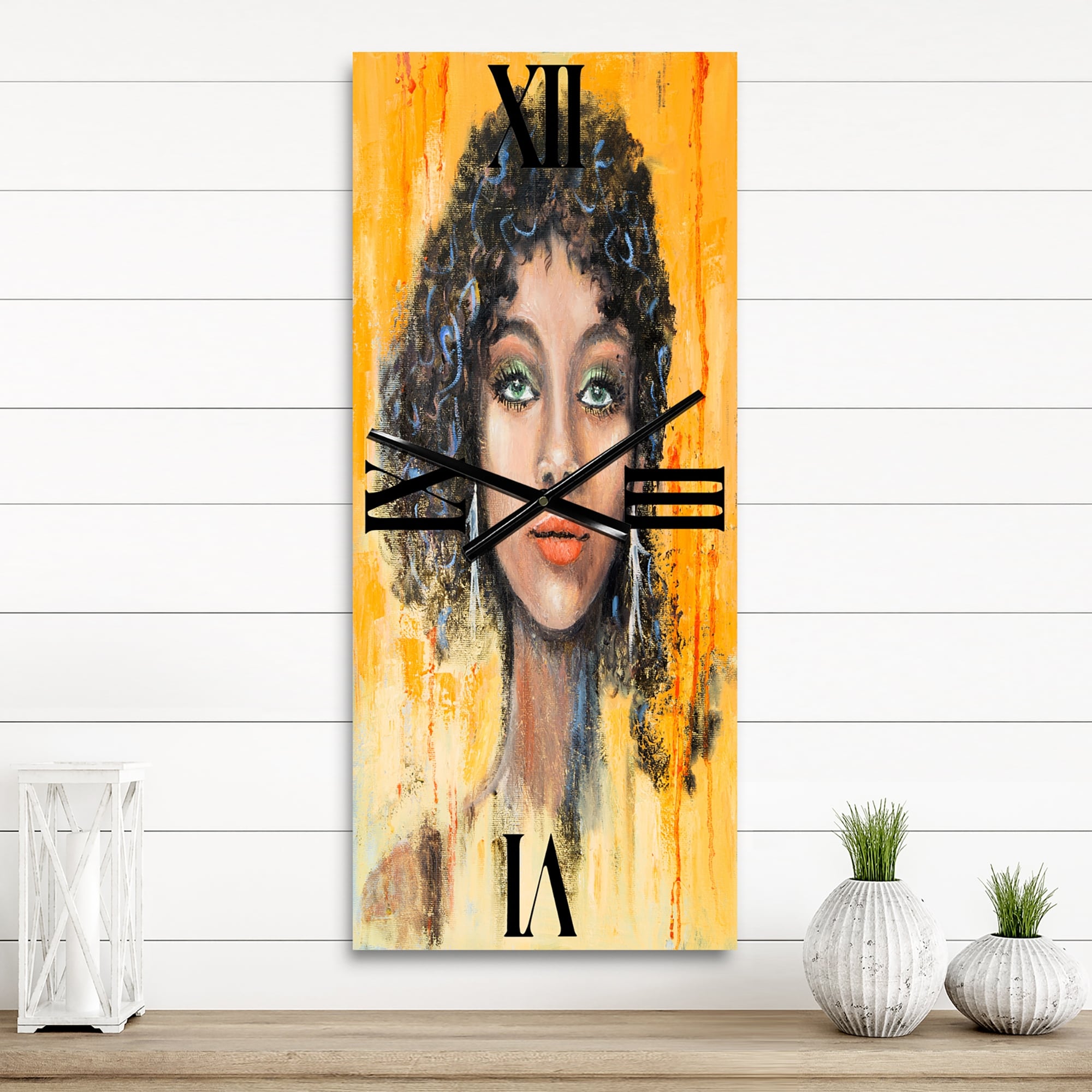 Designart 'Woman Face With Green Eyes & Black Hair Impression' Modern Wall Clock Decor