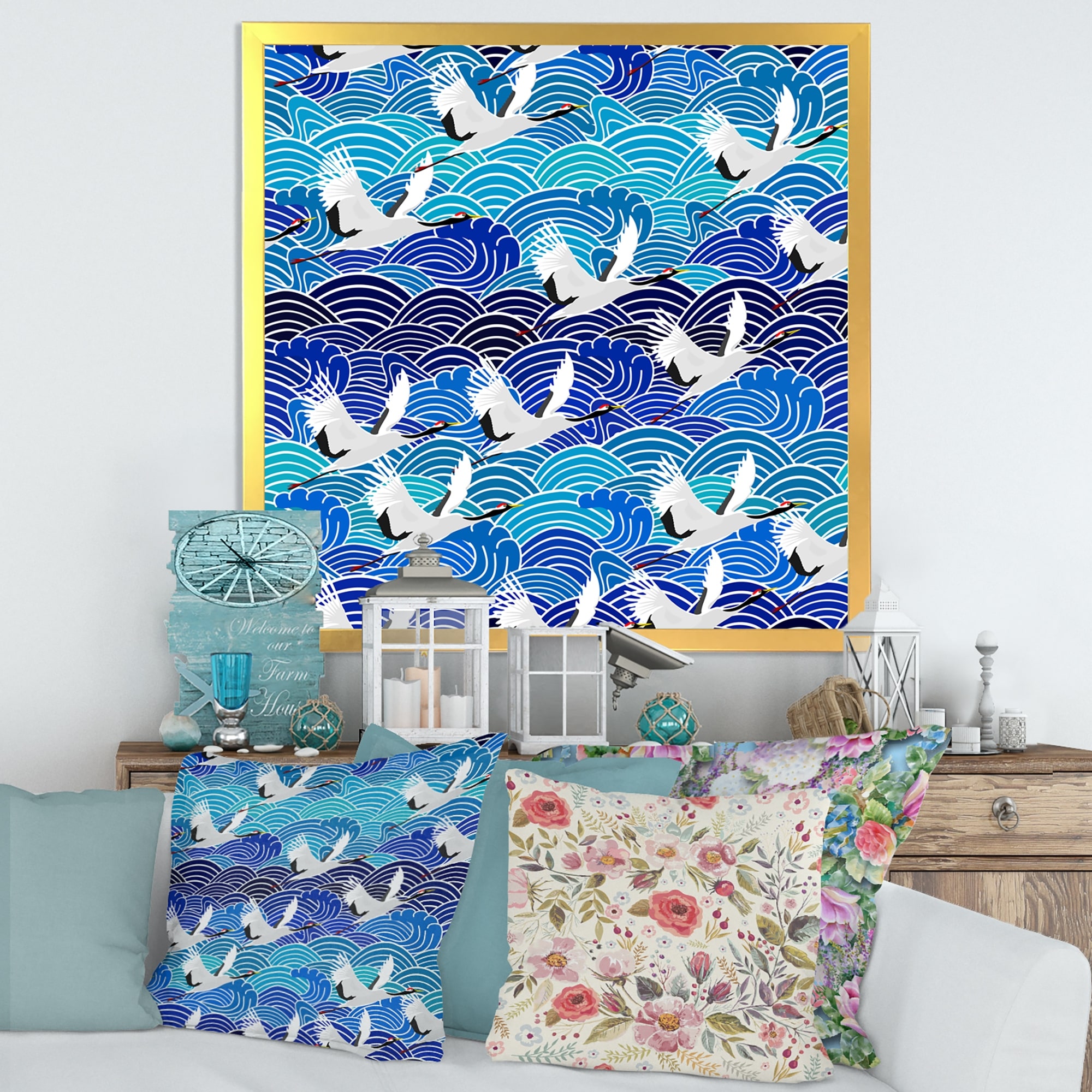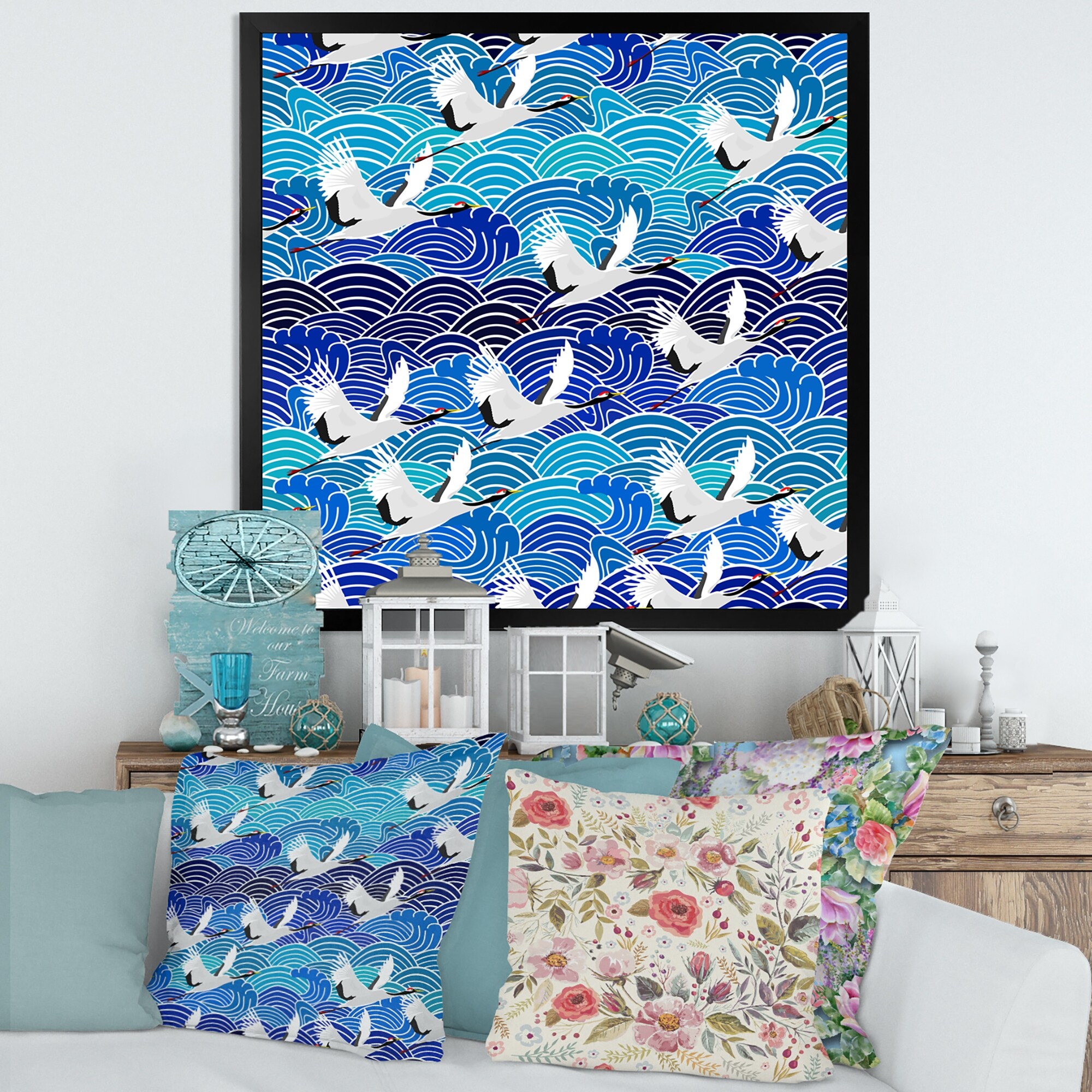 Designart "Japanese Crane Birds on Blue Waves" Patterned Framed Art Print