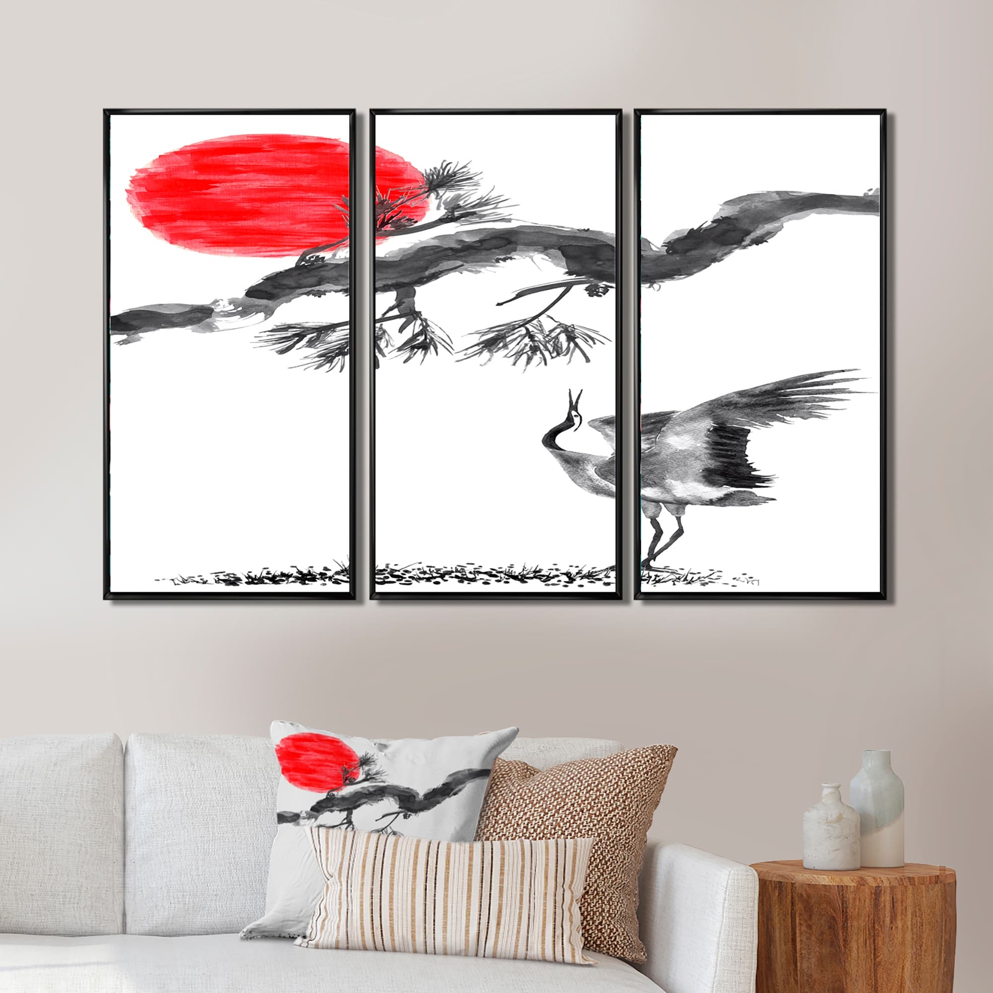 Designart "Chinese Pine With Japanese Crane Bird" Traditional Framed Wall Decor Set of 3 - 4 Colors of Frames