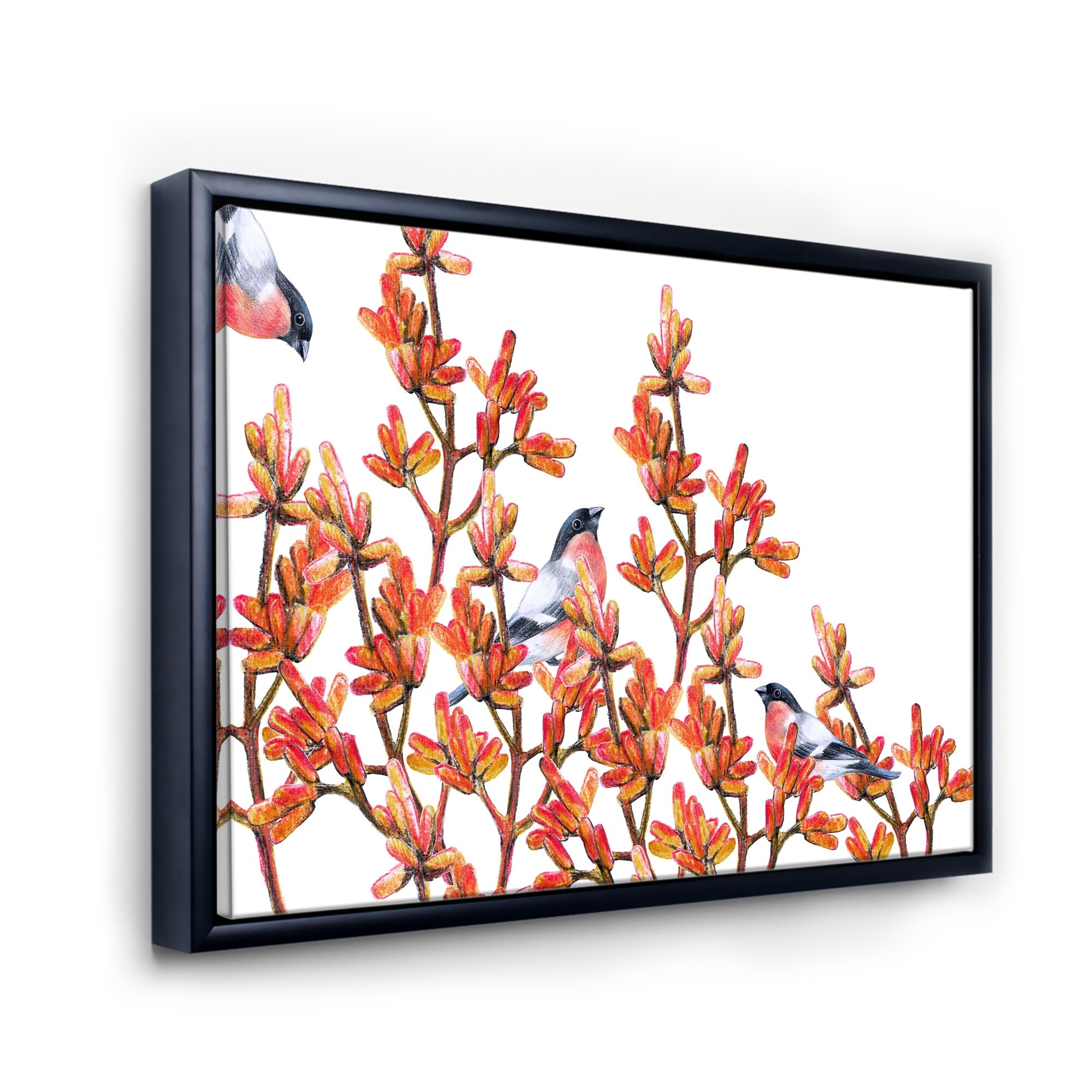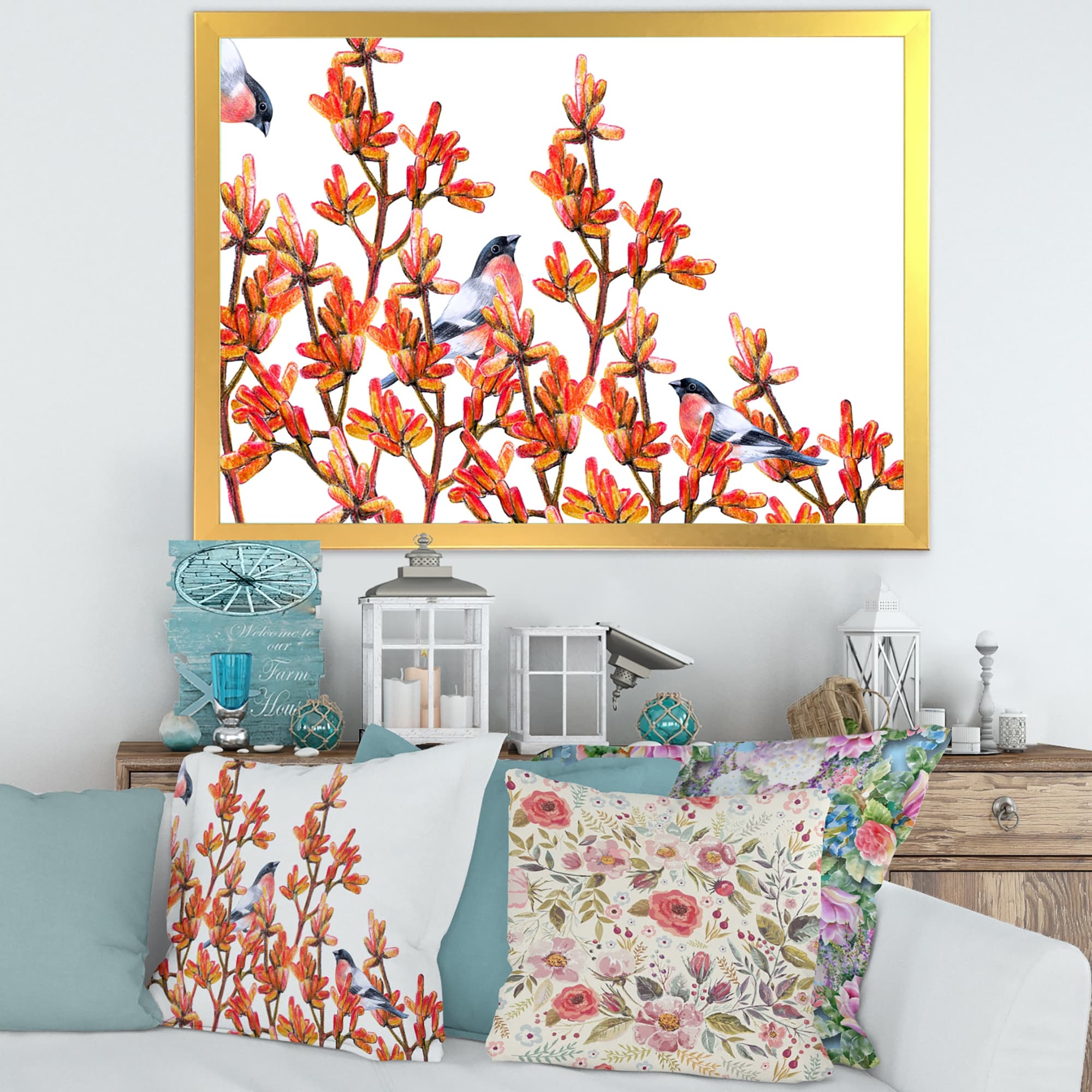 Designart "Flock of Bullfinches Birds on Orange Branches" Traditional Framed Canvas Wall Art Print