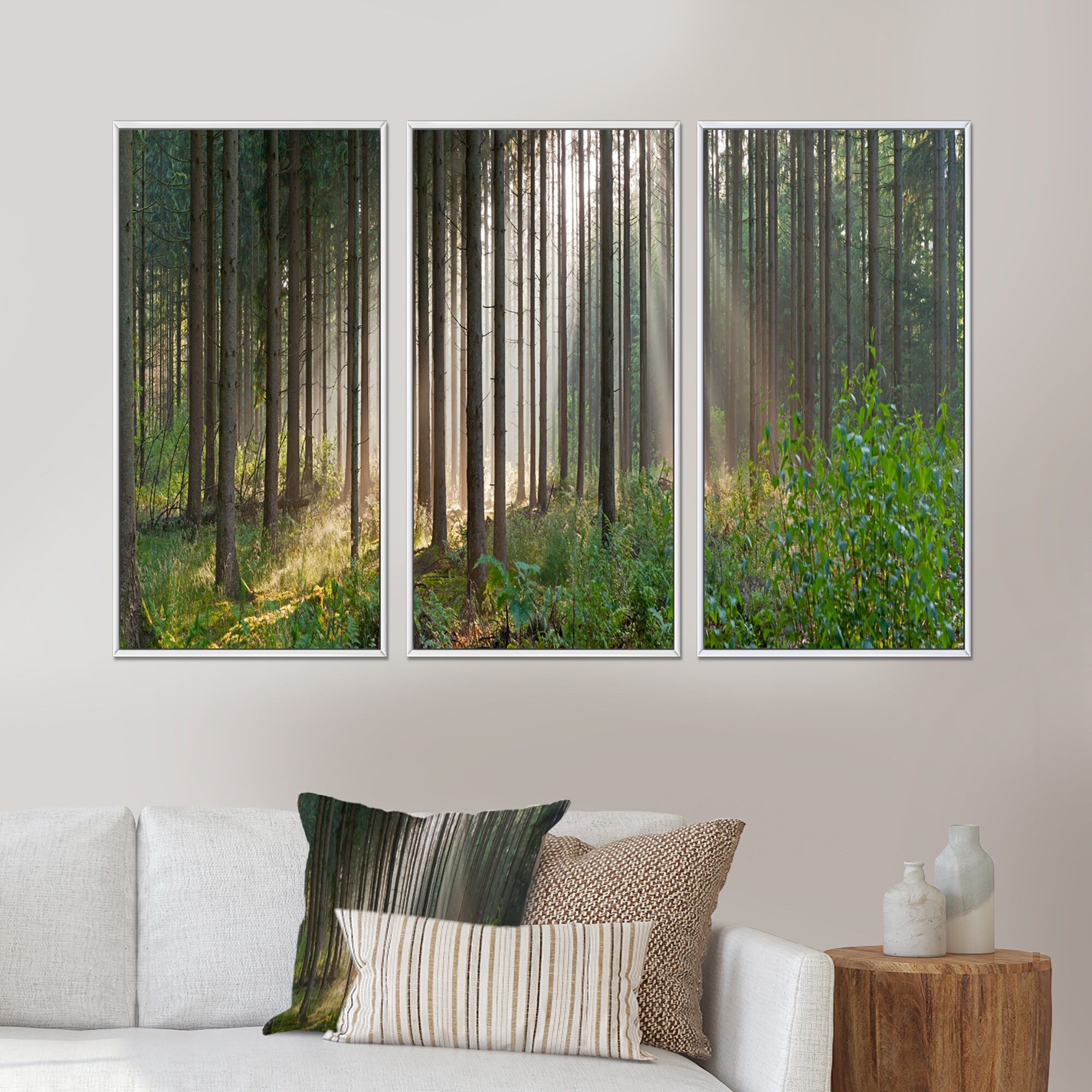 Designart "Green Forest in Mist Panorama" Landscape Framed Artwork Set of 3 - 4 Colors of Frames