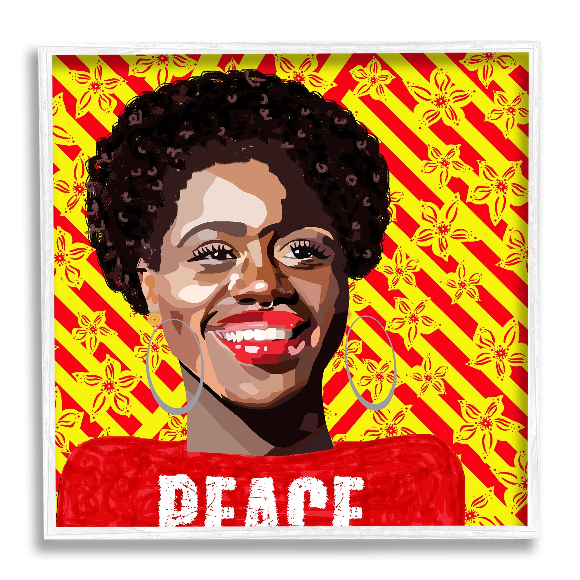 Stupell Industries Peace Text Smiling Woman Floral Red Stripes Framed Wall Art