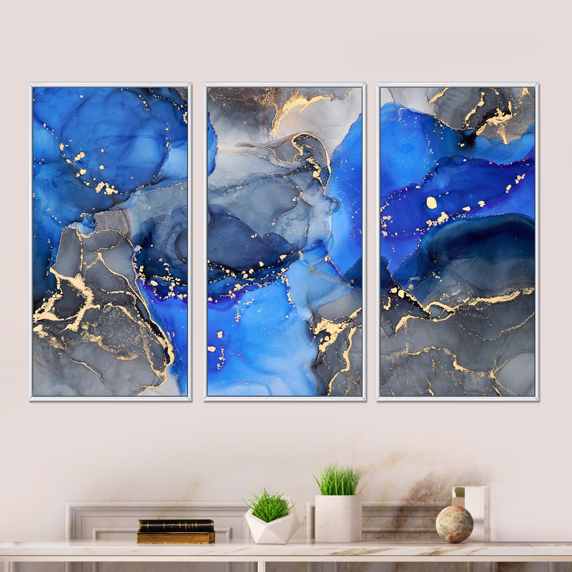 Designart "Blue Luxury Abstract Fluid Art XII" Modern Framed Art Prints Set of 3 - 4 Colors of Frames