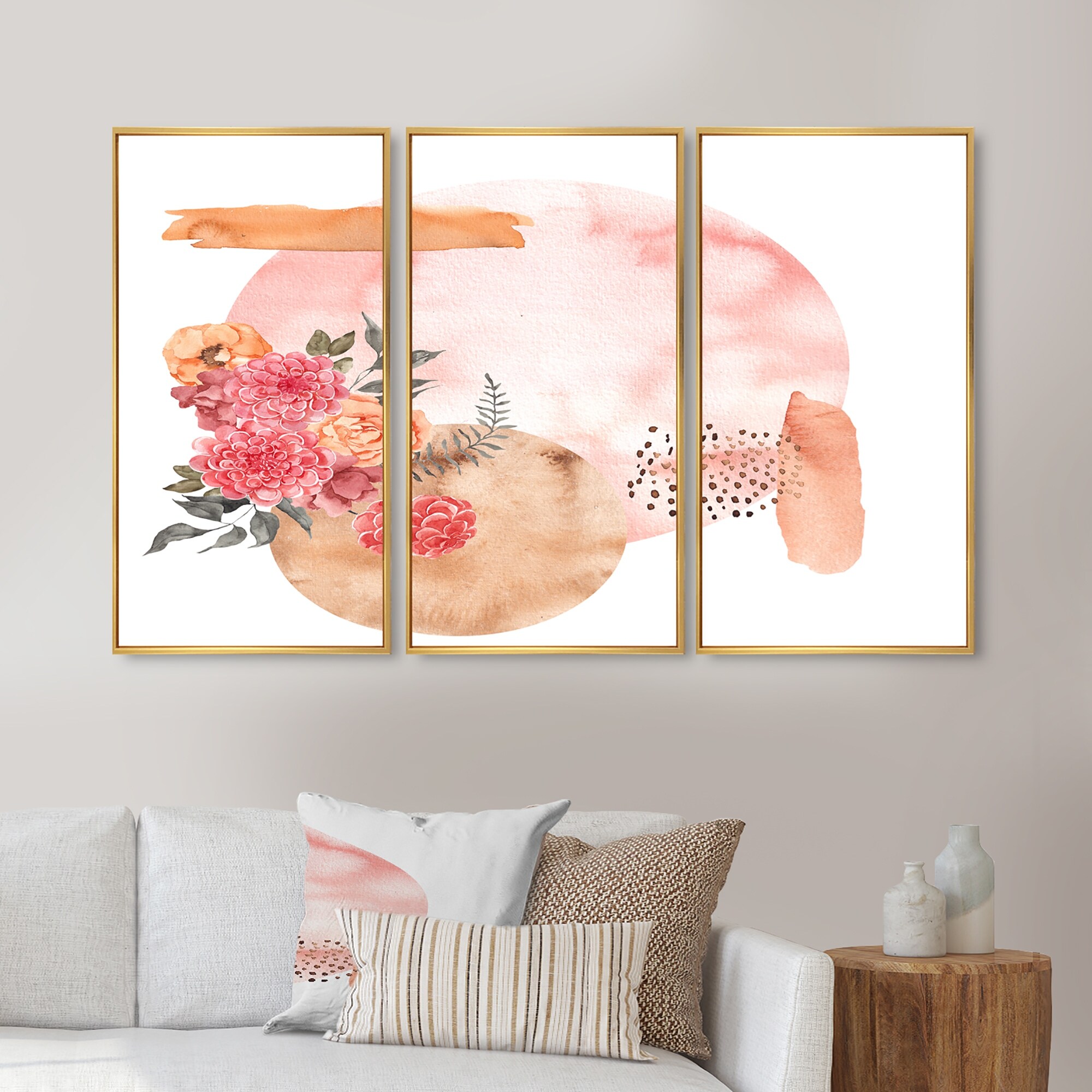 Designart "Pink And Orange Abstract Impression" Modern Framed Canvas Wall Art Set of 3 - 4 Colors of Frames