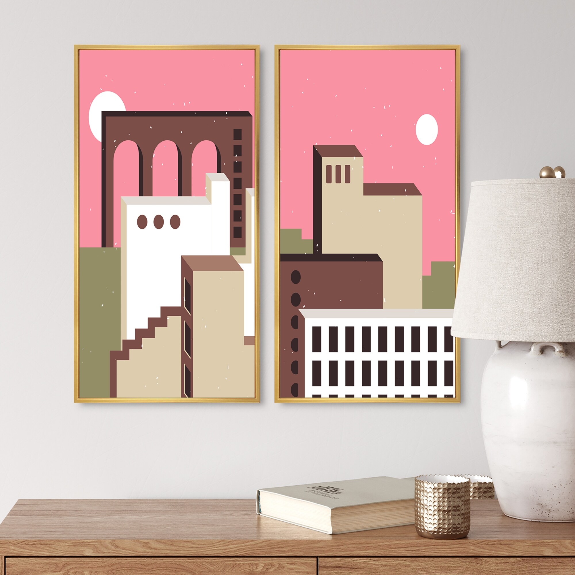 Designart "Minimal Abstract Shapes in Retro Colors II" Geometric Framed Art Set of 2 Pieces