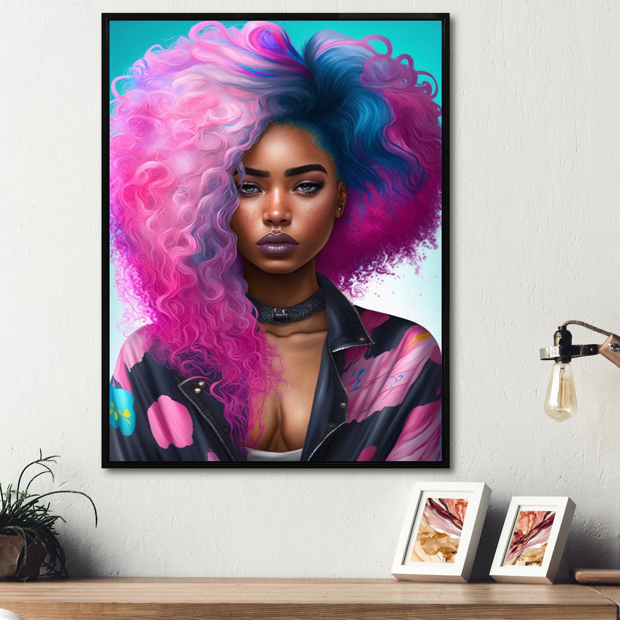 Designart "Pink And Blue African American Woman II" Contemporary Glam Framed Canvas Art Print
