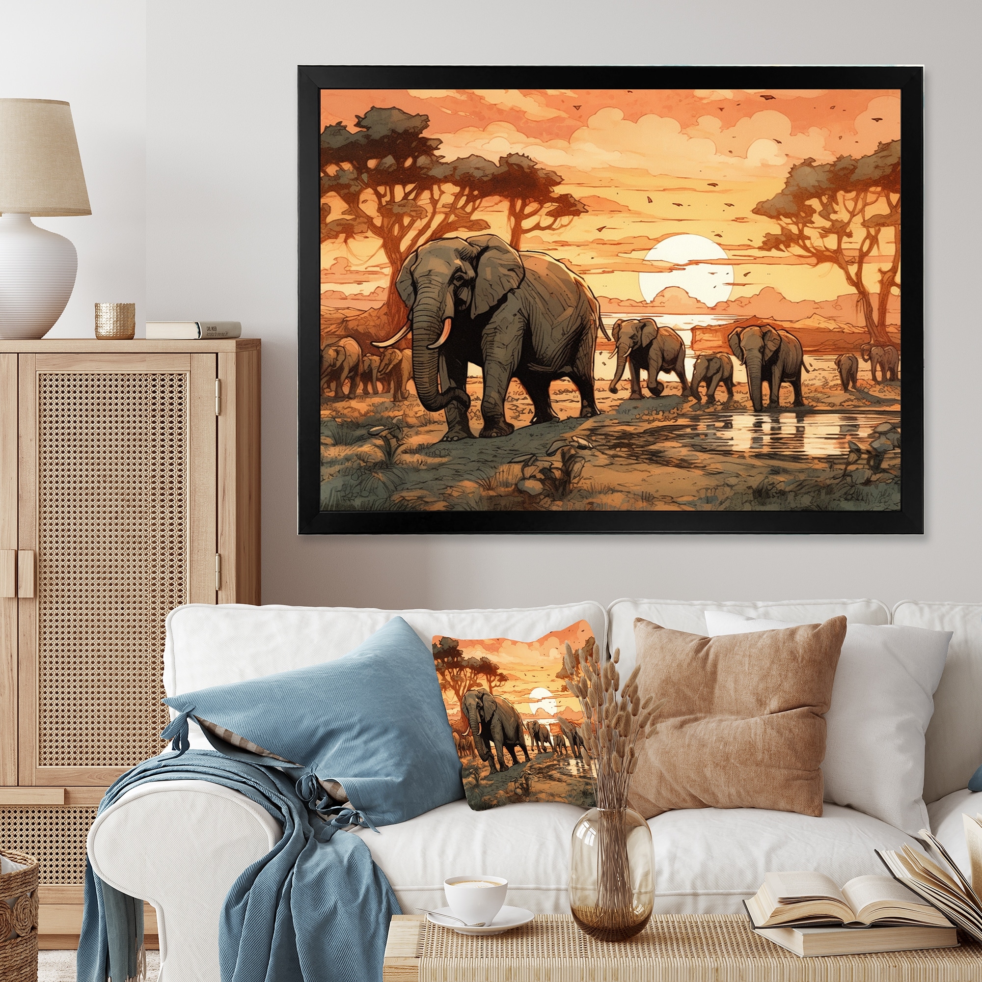 Designart "Orange African Safari With Elephants I" Animals Elephant Framed Wall Art for Living Room
