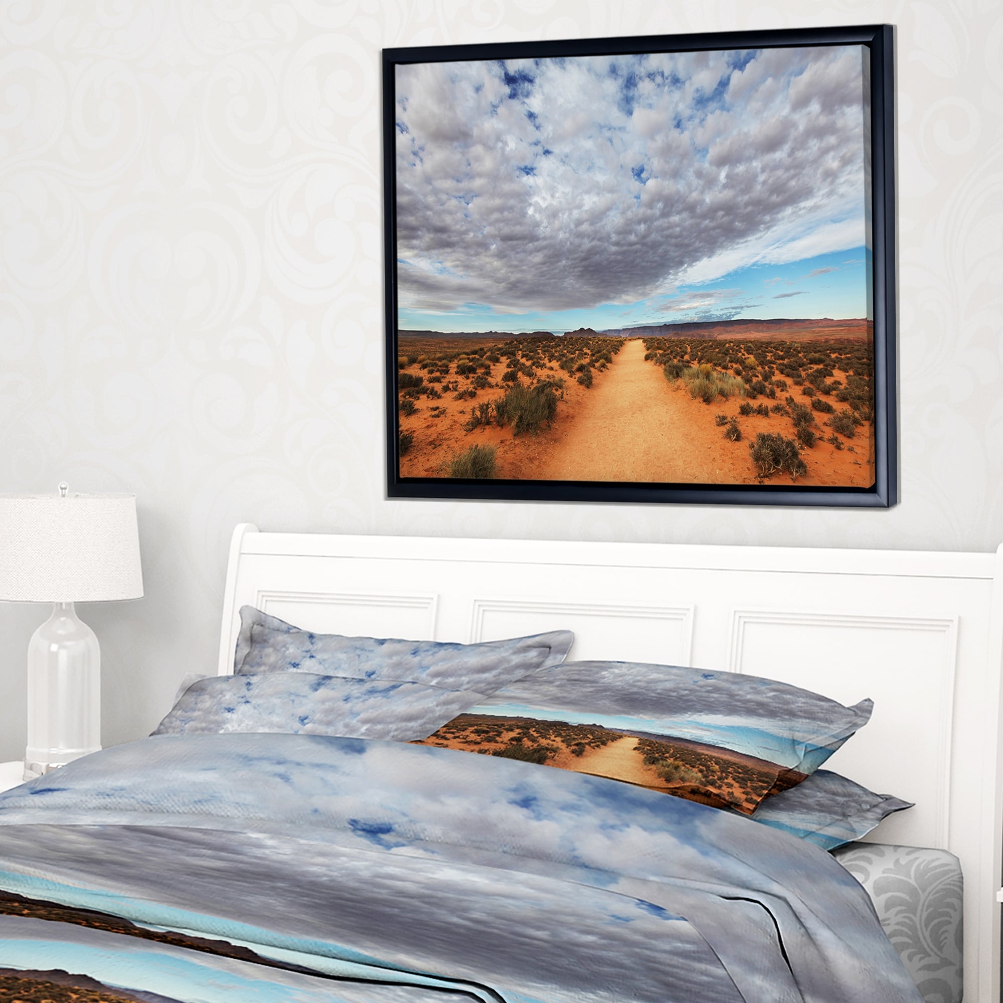 Designart "Desert Road under Bright Cloudy Sky" African Landscape Framed Canvas Art Print