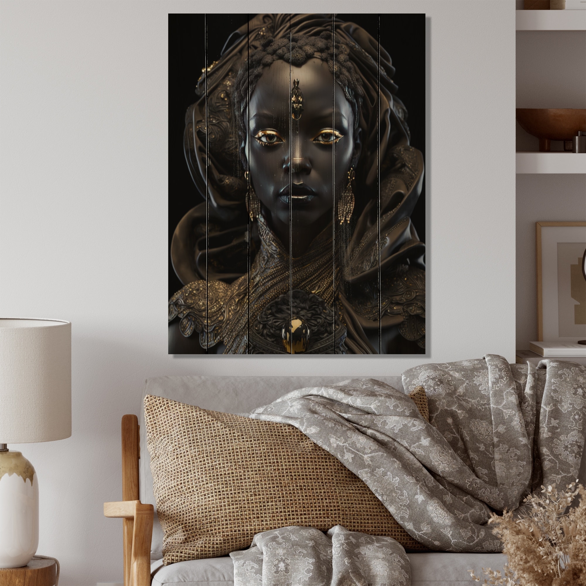 Designart "Close-Up Black And Gold African Goddess VII" African American Woman Print on Natural Pine Wood