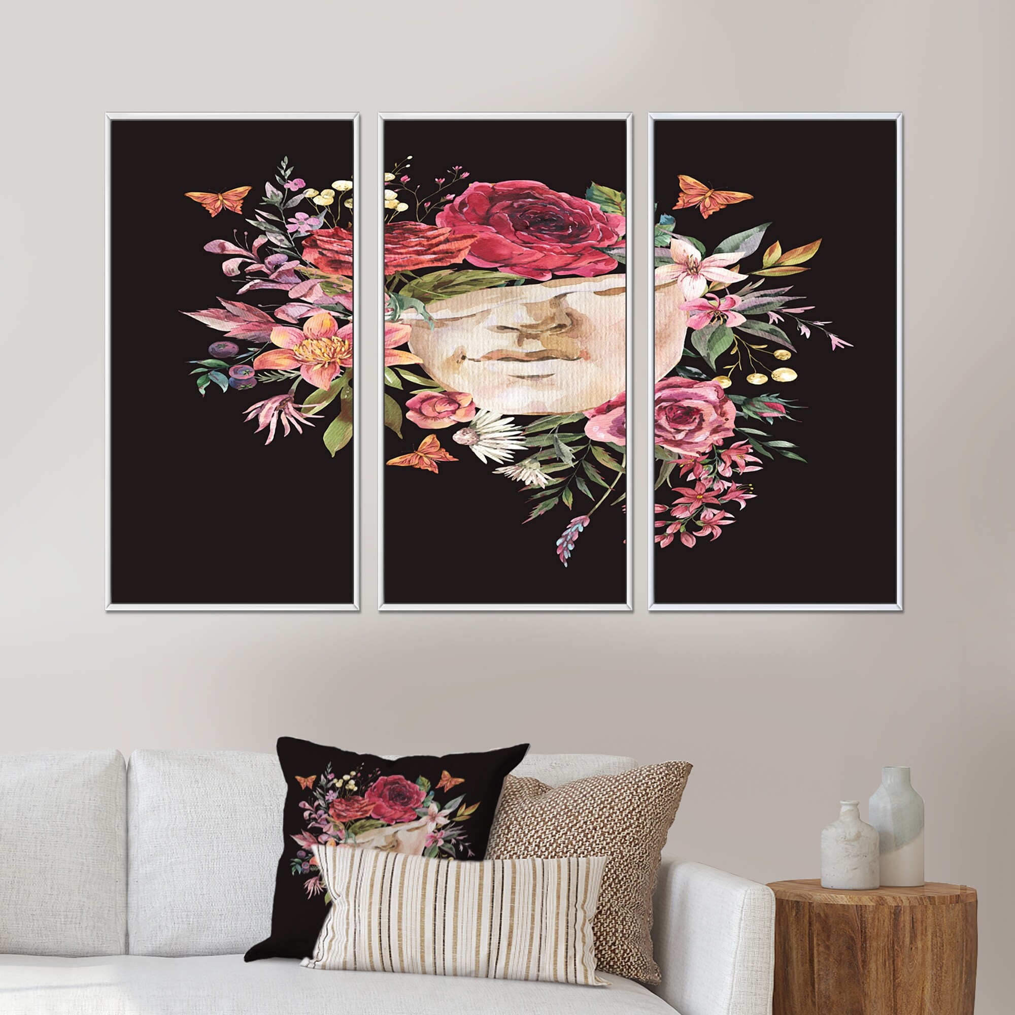 Designart "Vintage Greek Sculpture Detail With Dry Flowers" Traditional Framed Wall Decor Set of 3 - 4 Colors of Frames