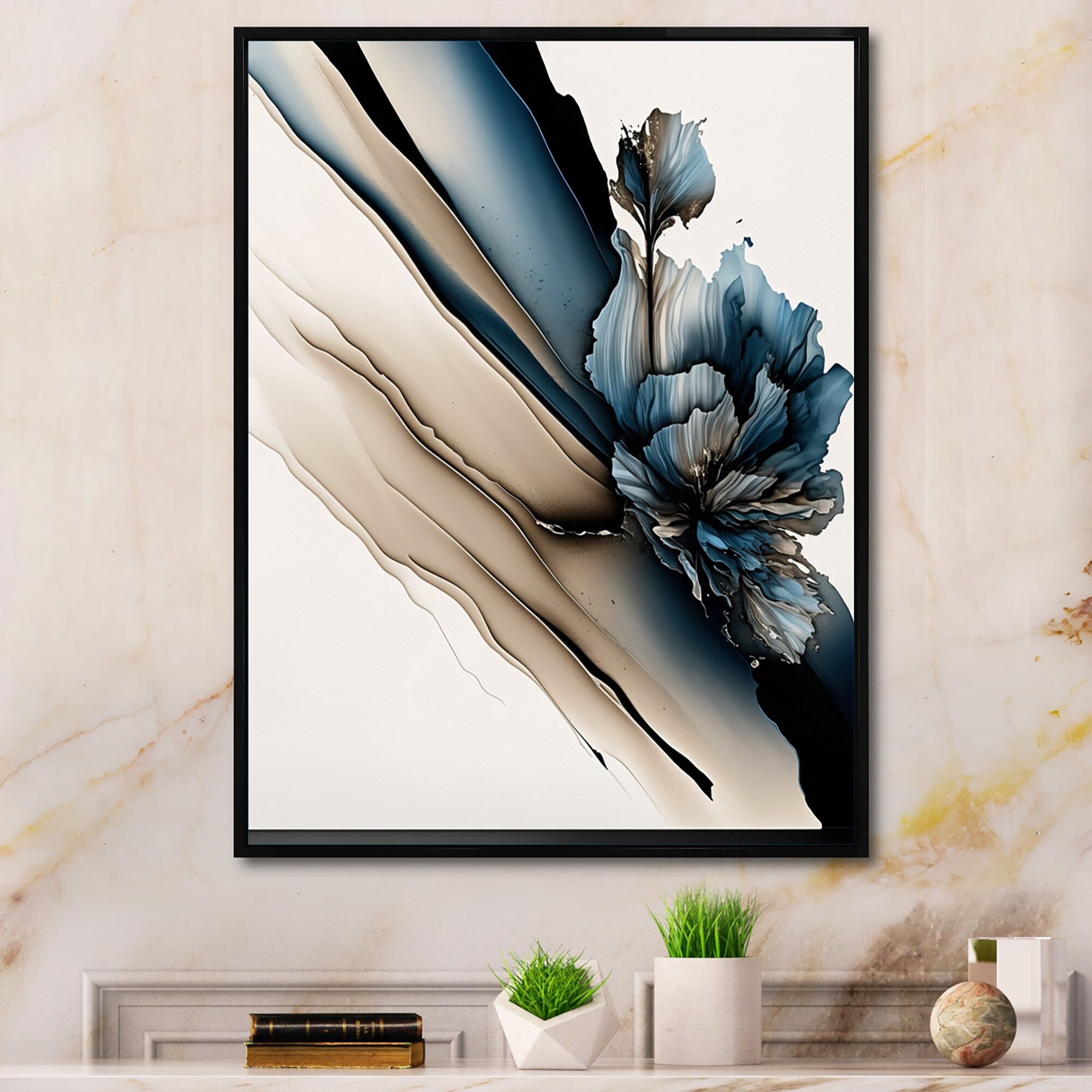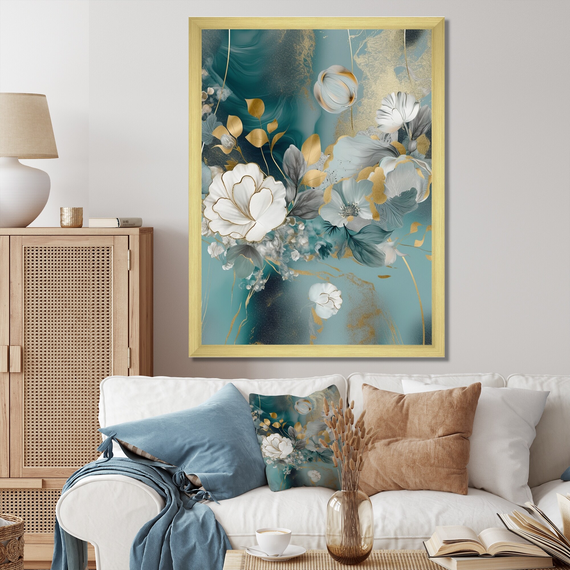 Designart "Golden Blue Marble Flowers Iv" Floral Framed Canvas Wall Art