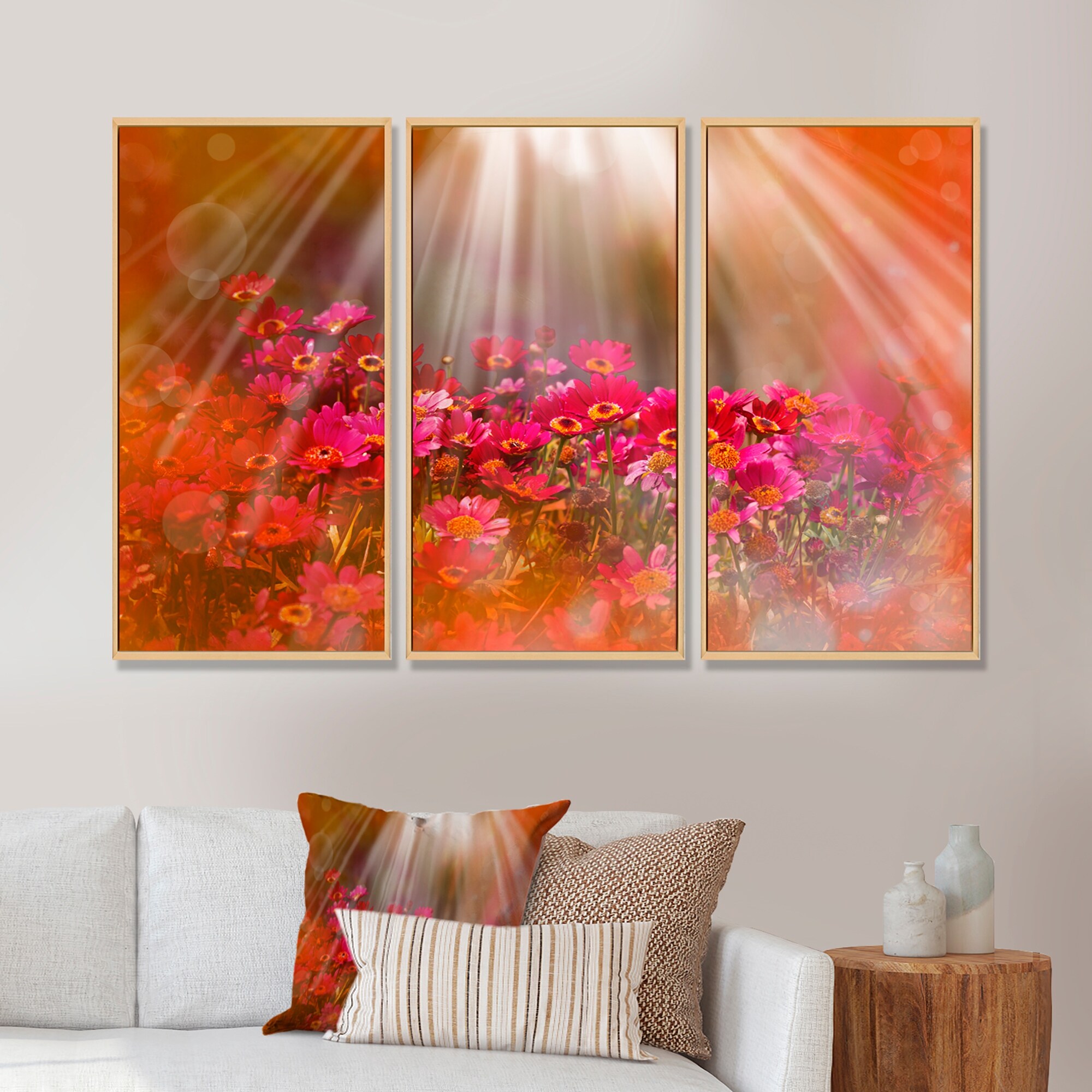 Designart "Sunlight over Garden with Flowers" Floral Framed Canvas Wall Art Set of 3 - 4 Colors of Frames
