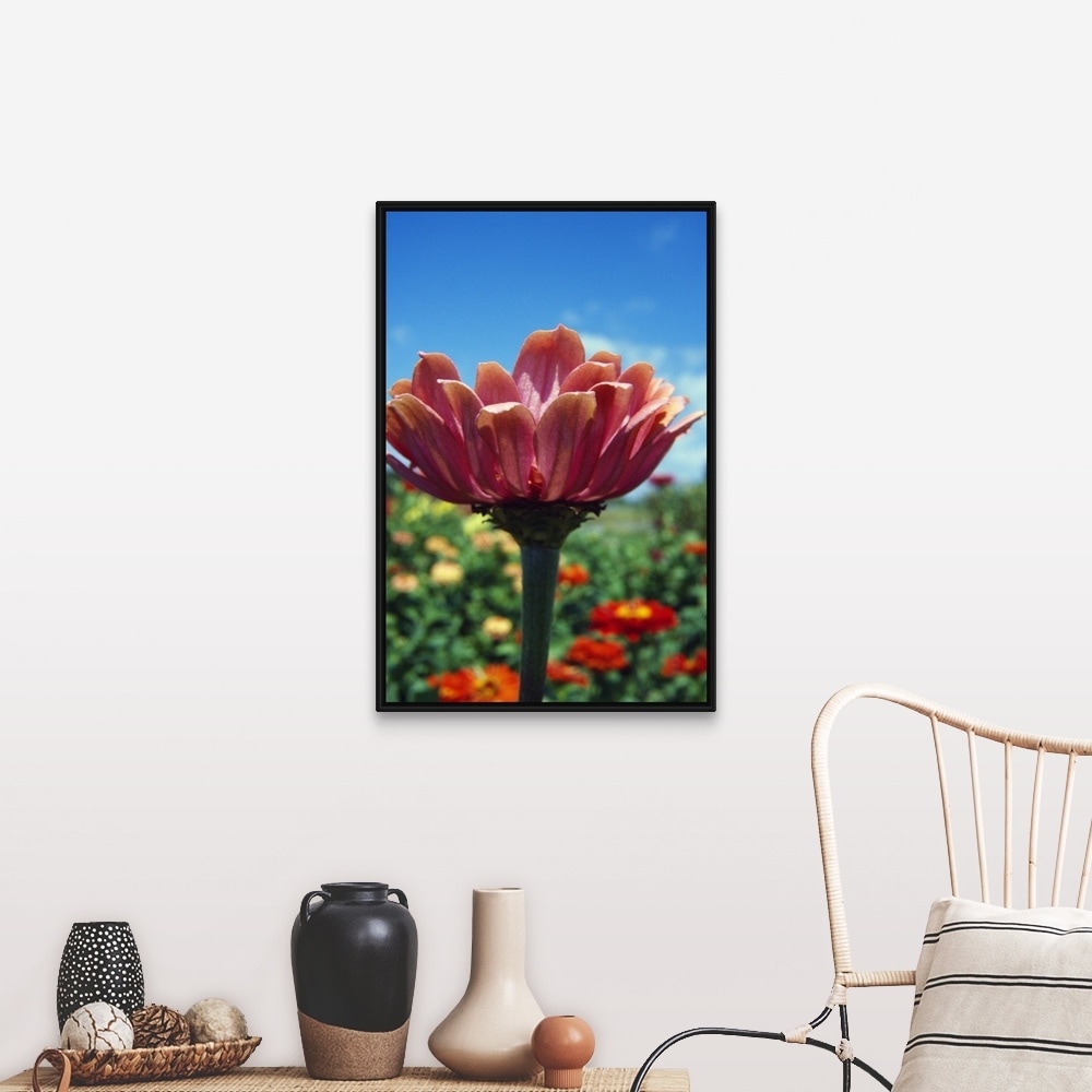 "Low angle view of zinnia flower (Zinnia elegans) blooming, close up." Black Float Frame Canvas Art