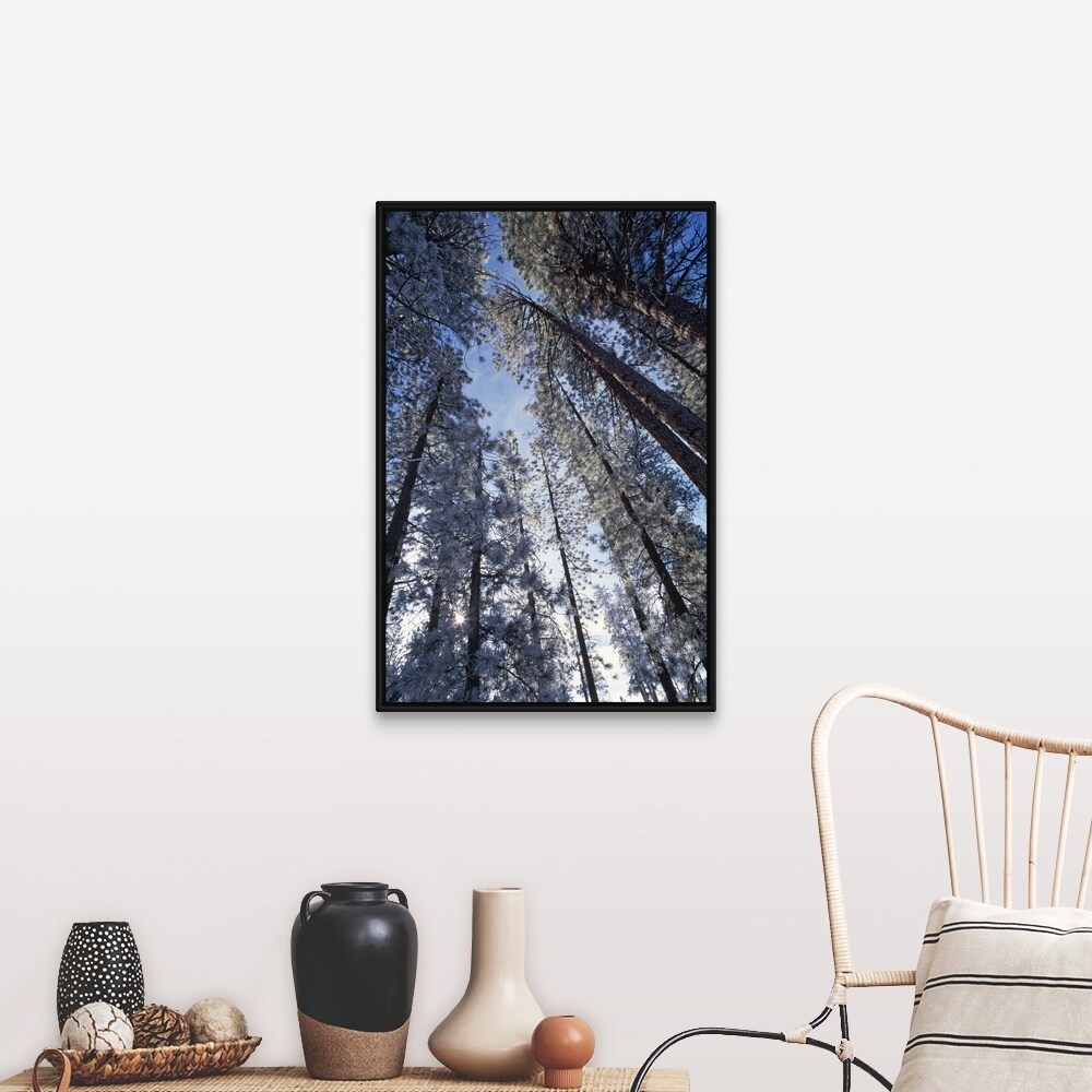 "Low Angle View of Pine Trees" Black Float Frame Canvas Art