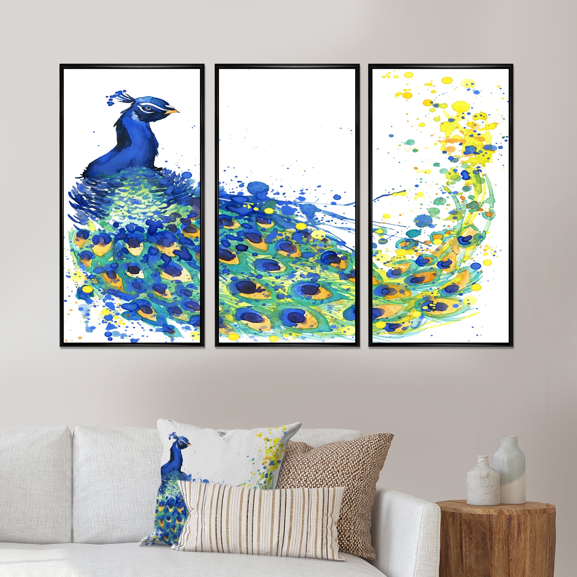 Designart "Exotic Peacock Watercolor" Animal Framed Wall Decor Set of 3 - 4 Colors of Frames