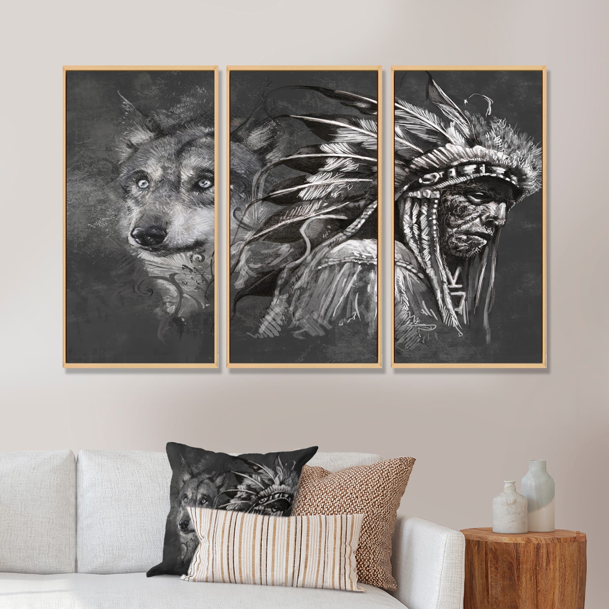 Designart "Wolf and American Indian Chief" Animal Framed Art Prints Set of 3 - 4 Colors of Frames