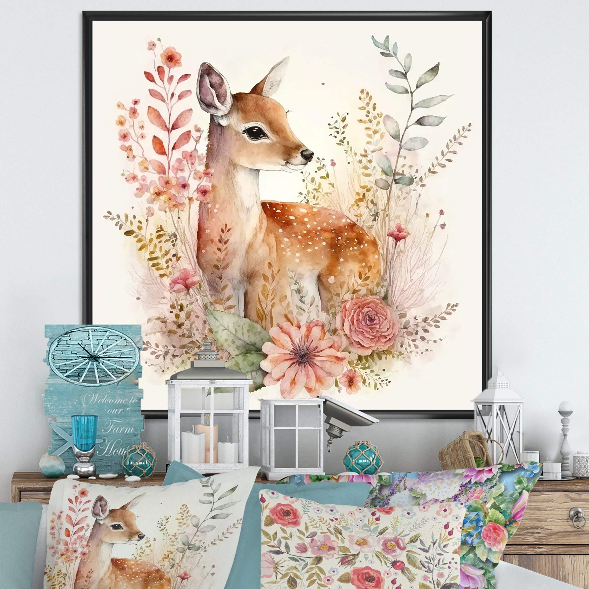 Designart "Cute Little Deer With Pink Flowers" Animal Landscape Framed Canvas Wall Art Print