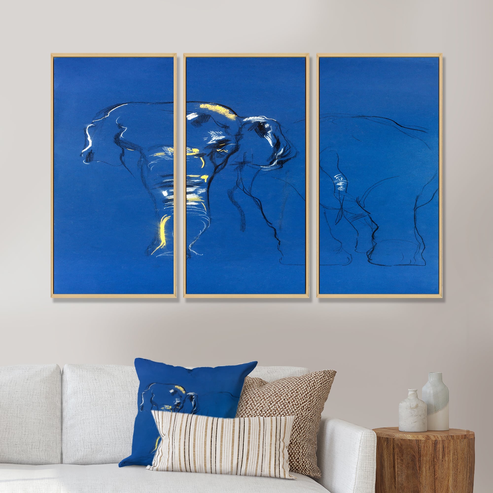 Designart "Elephant sketch in Blue background" Animal Framed Wall Decor Set of 3 - 4 Colors of Frames