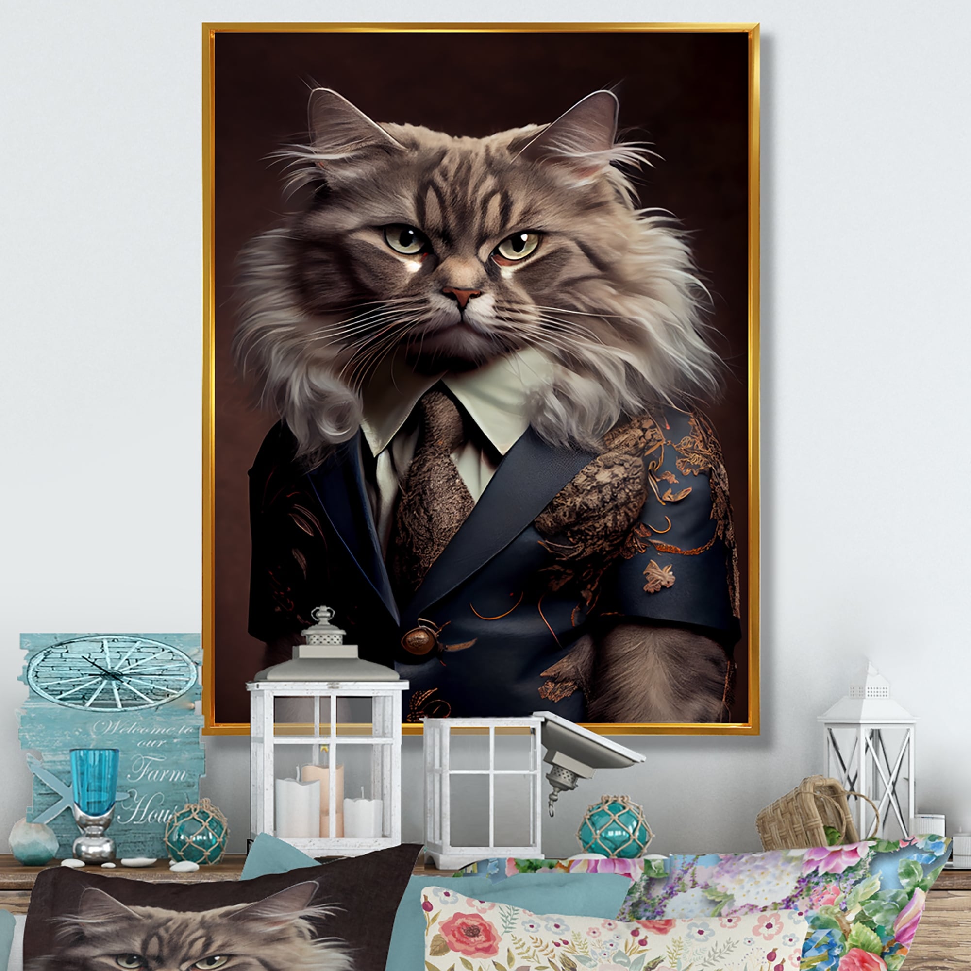 Designart "Stylish Cat in Fancy Blue Fashion Design I" Animals Cat Framed Canvas Wall Art Print