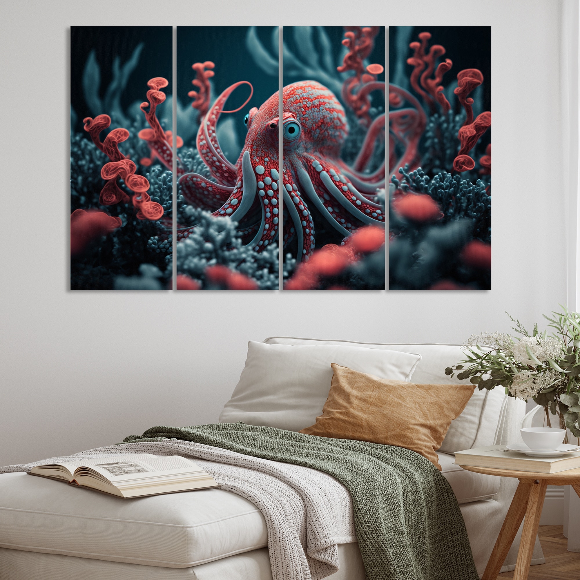 Designart "Red Octopus on the Ocean Floor I" Animal Octopus Multipanel Wall Art Living Room