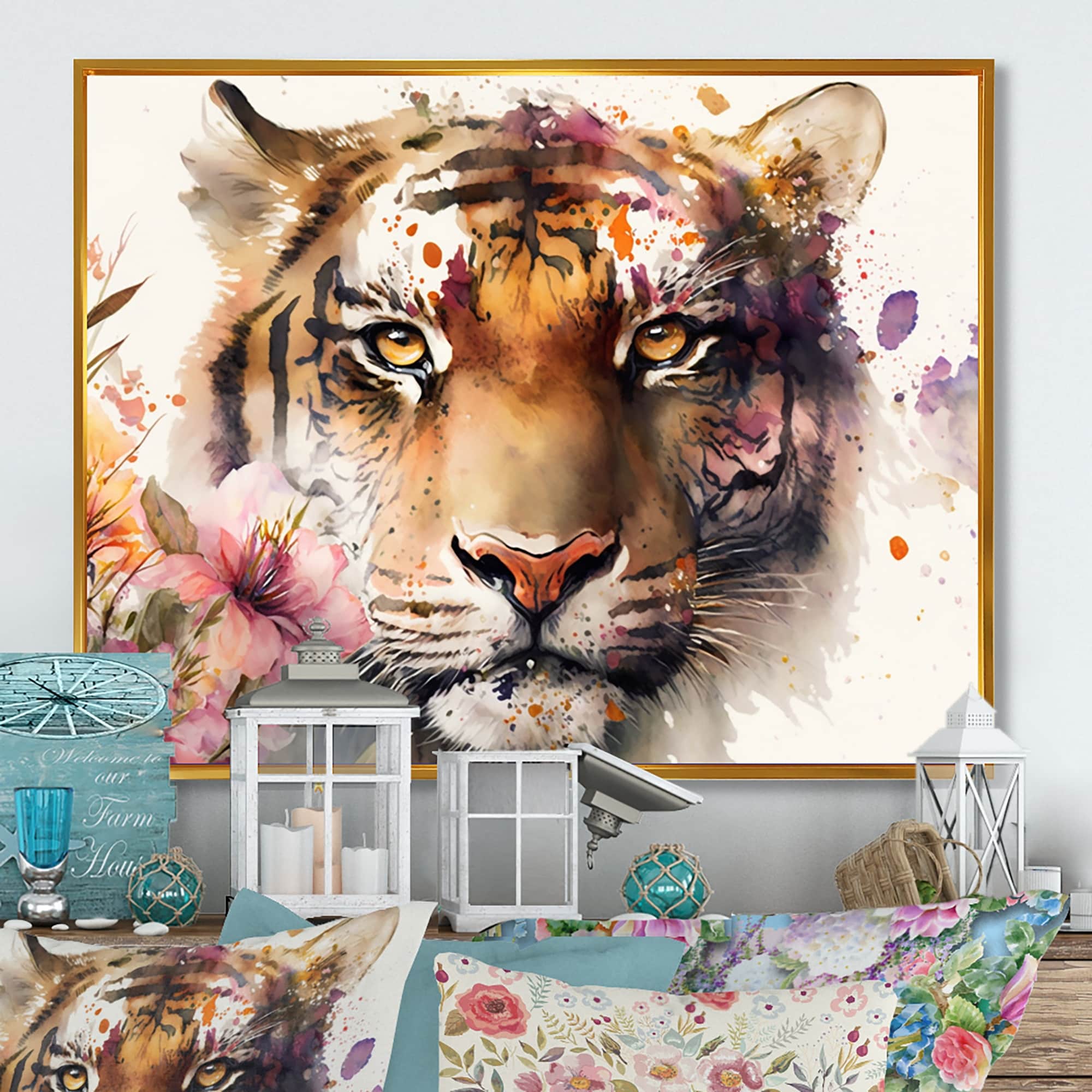 Designart "Tiger Portrait With Flowers I" Animals Framed Canvas Art Print