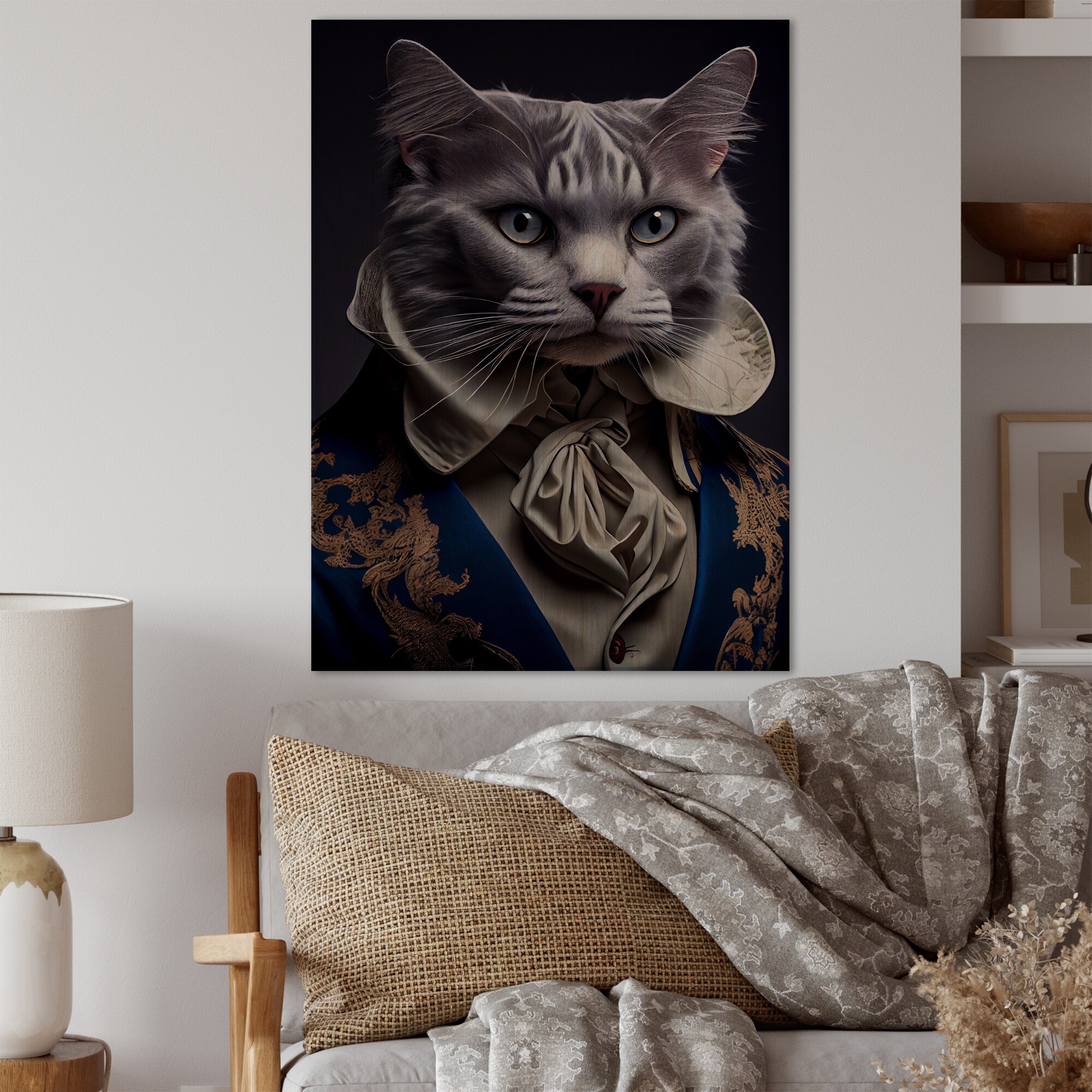 Designart 'Stylish Cat in Fancy Blue Fashion Design I' Animals Cat Wood Wall Art - Natural Pine Wood