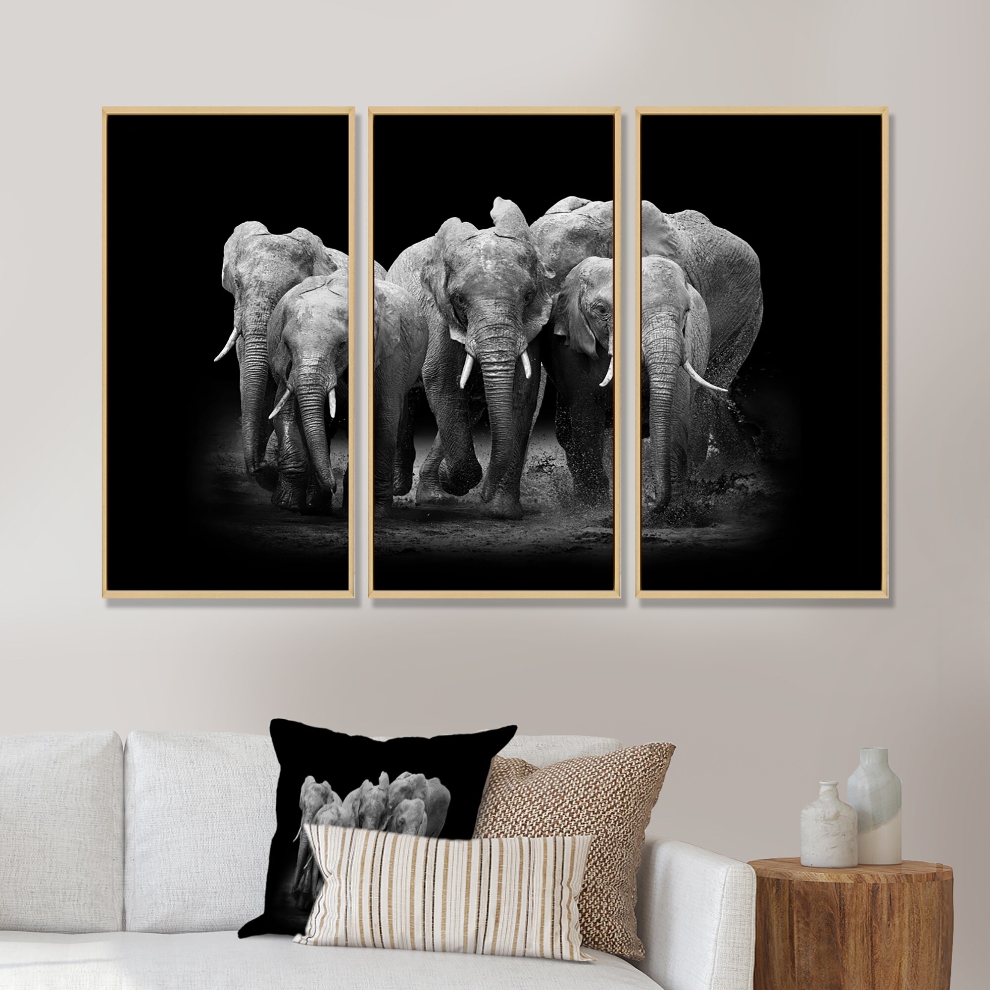 Designart "Group of Elephant on dark " Animal Framed Canvas Wall Art Set of 3 - 4 Colors of Frames