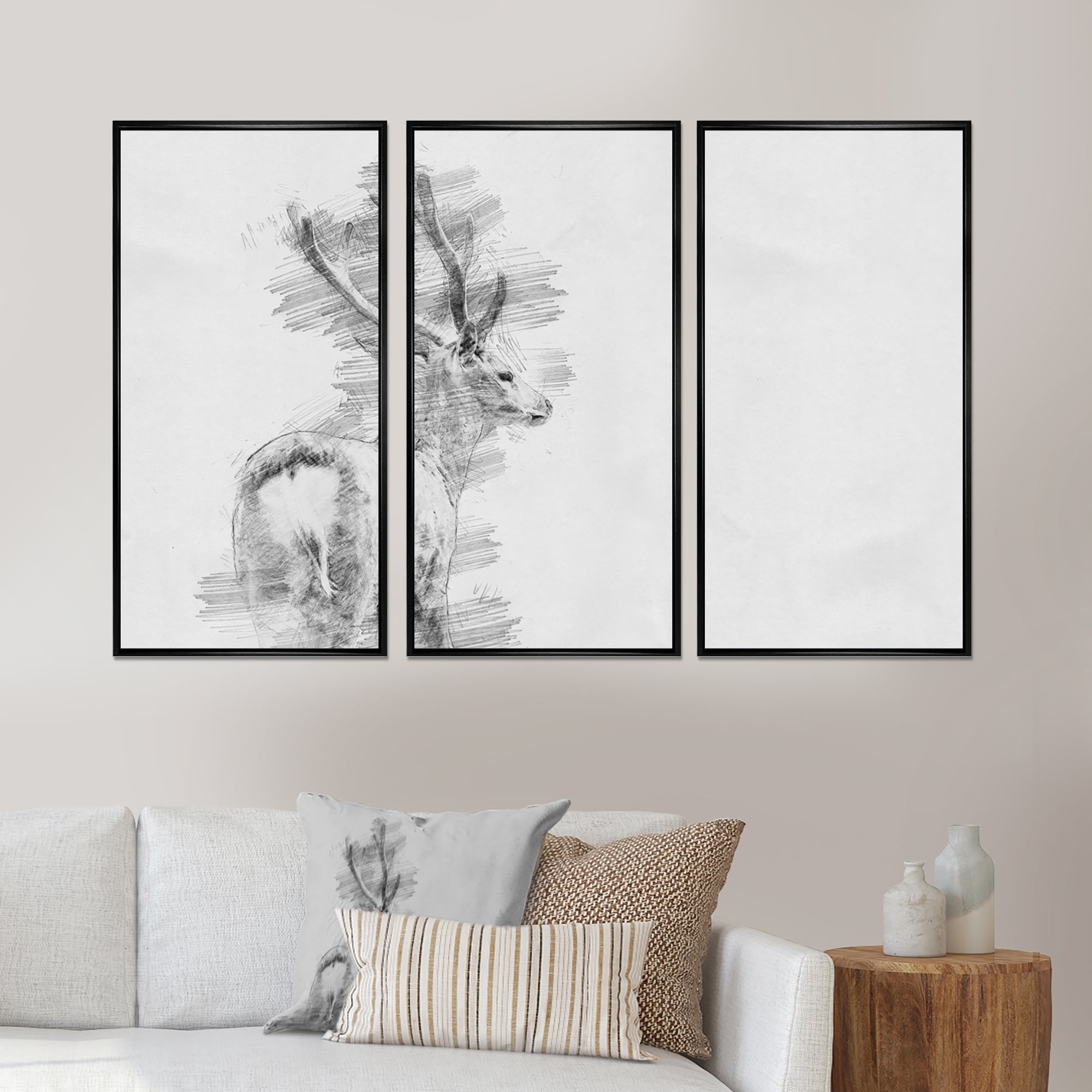 Designart "Black and White Deer Sketch " Animal Framed Artwork Set of 3 - 4 Colors of Frames