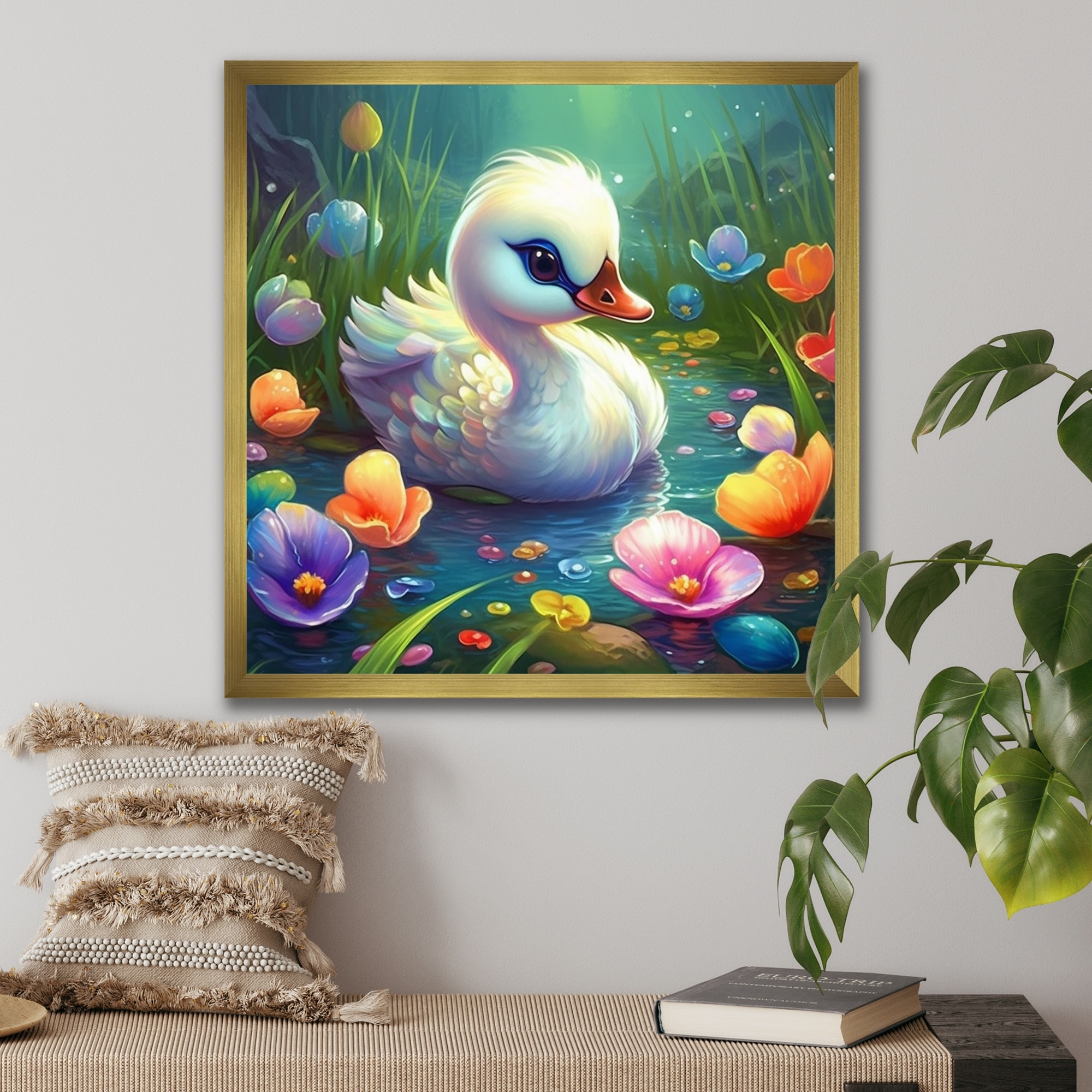 Designart "Cute Baby Swan I" Animals Swans Framed Wall Decor