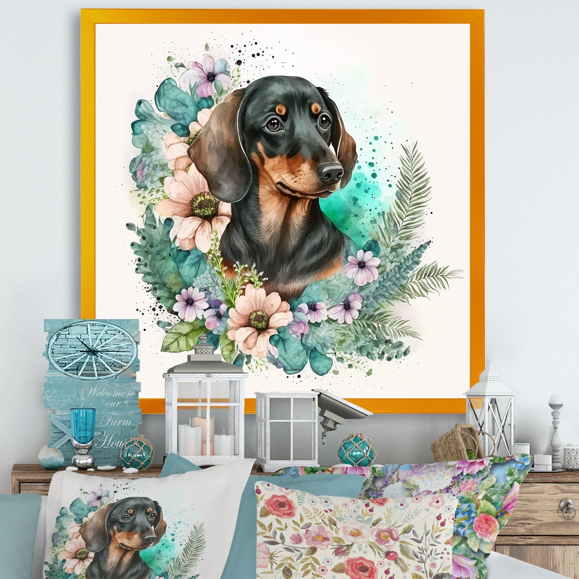 Designart "Cute Watercolor Dachshund With Flowers I" Animals Framed Art Print