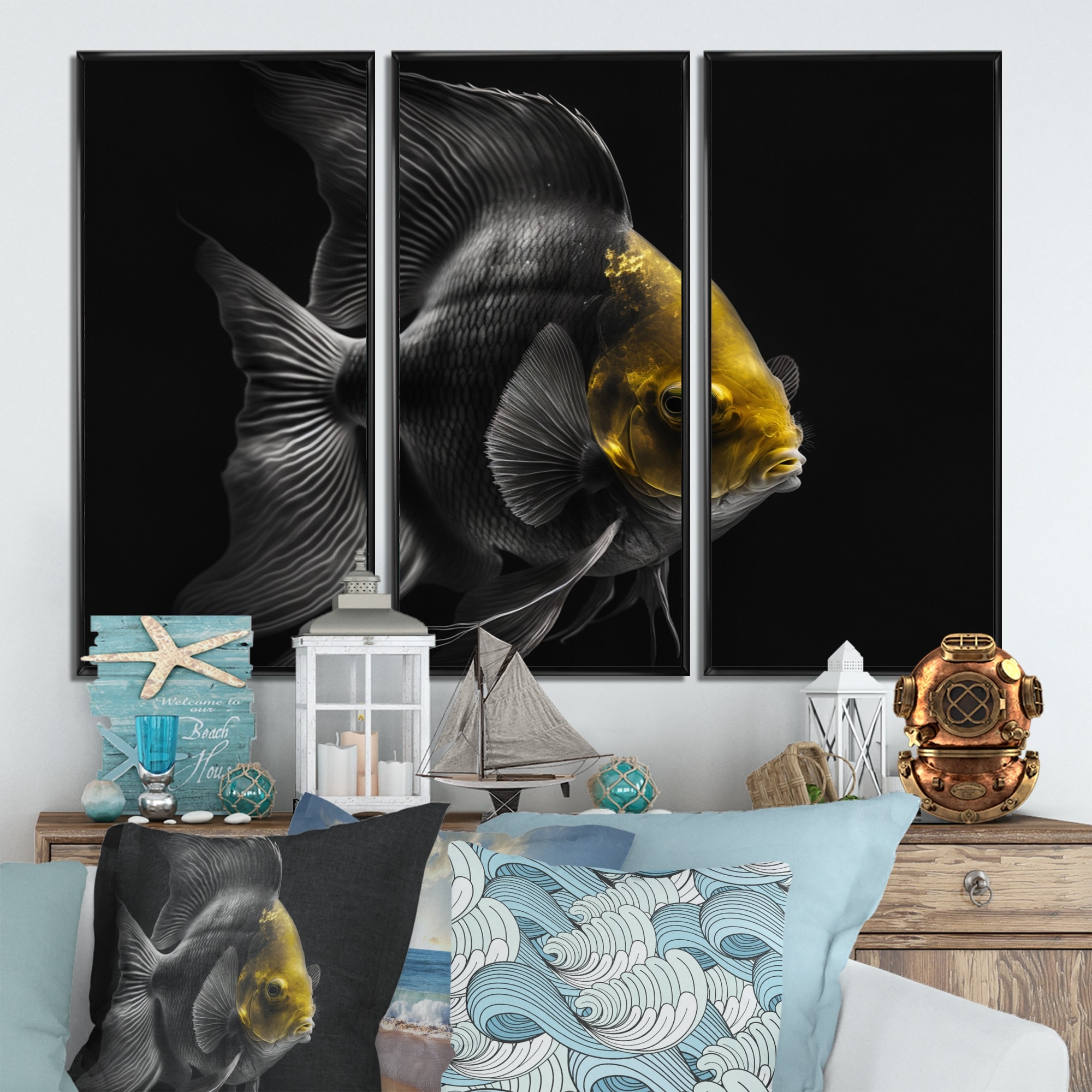 Designart "Tropical Blue Fish in Shades of Blue And Orange III" Animal Fish Framed Canvas Wall Art Print - 3 Panels