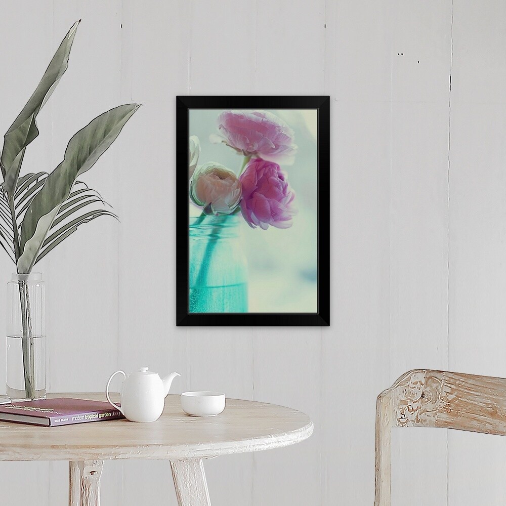 "Pink and white ranunculus flowers in aqua colored vase." Black Framed Print