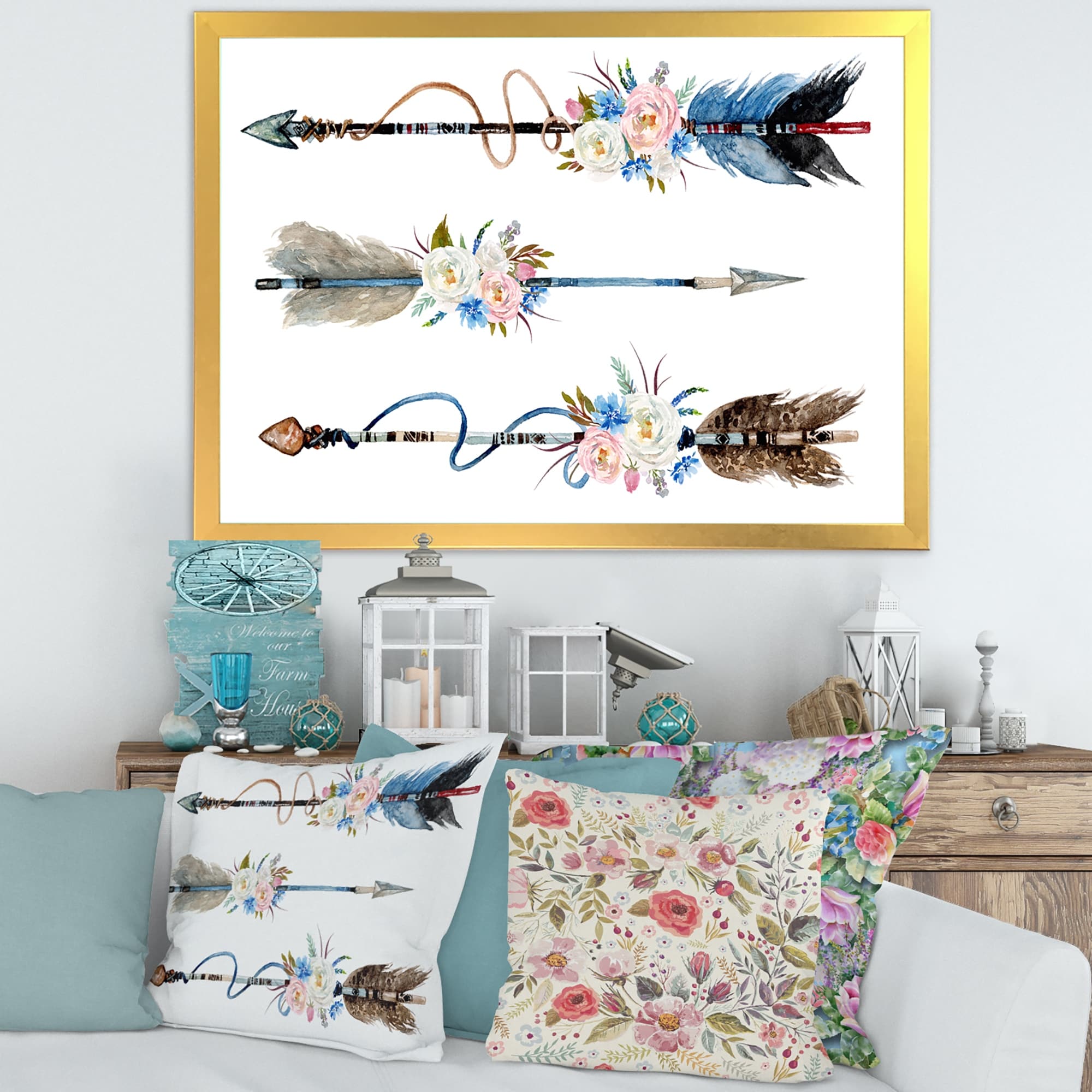 Designart "Ethnic Feathers and Flowers on Native Arrows I" Bohemian & Eclectic Framed Art Print