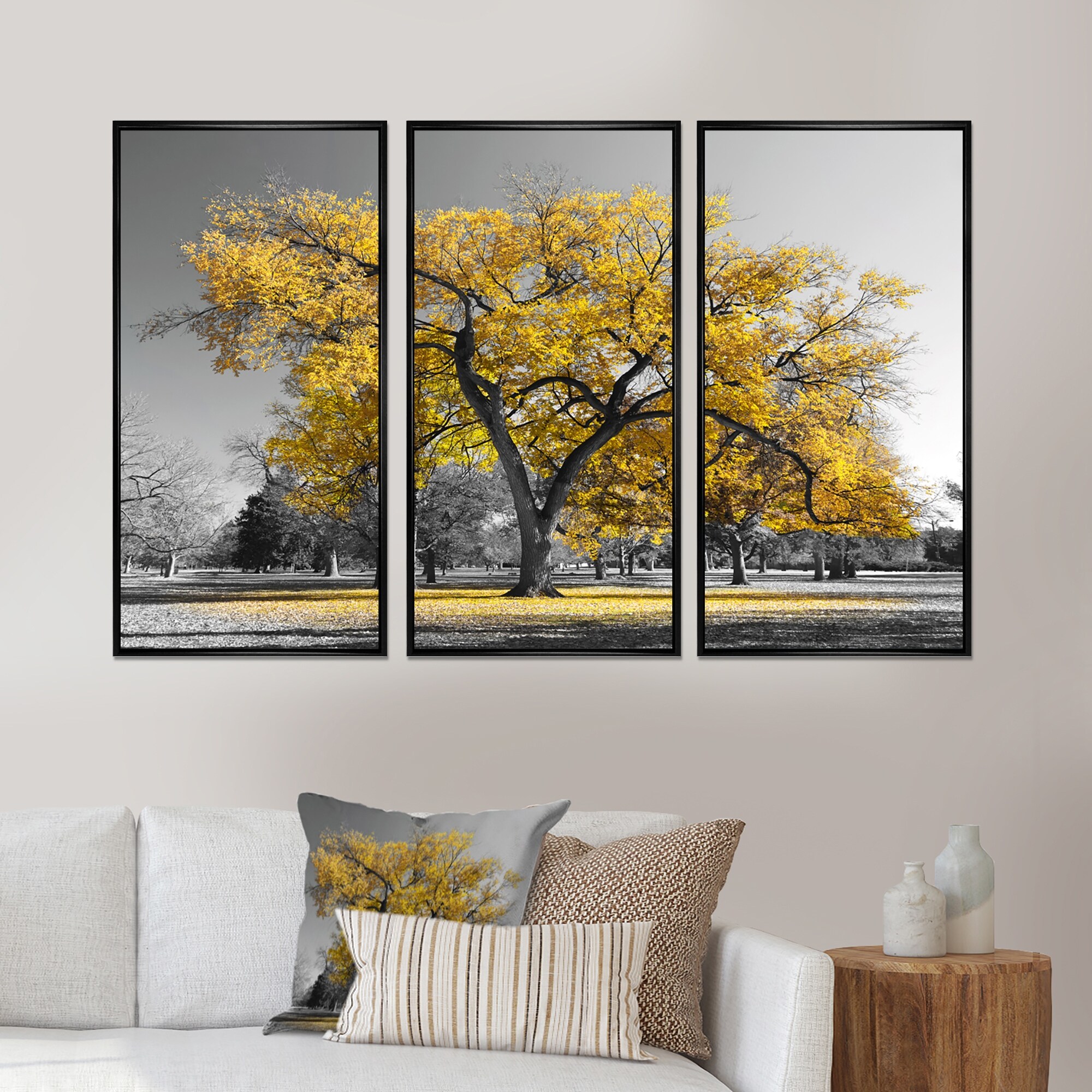 Designart "Big Golden Tree" Landscape Framed Wall Art Set of 3 - 4 Colors of Frames