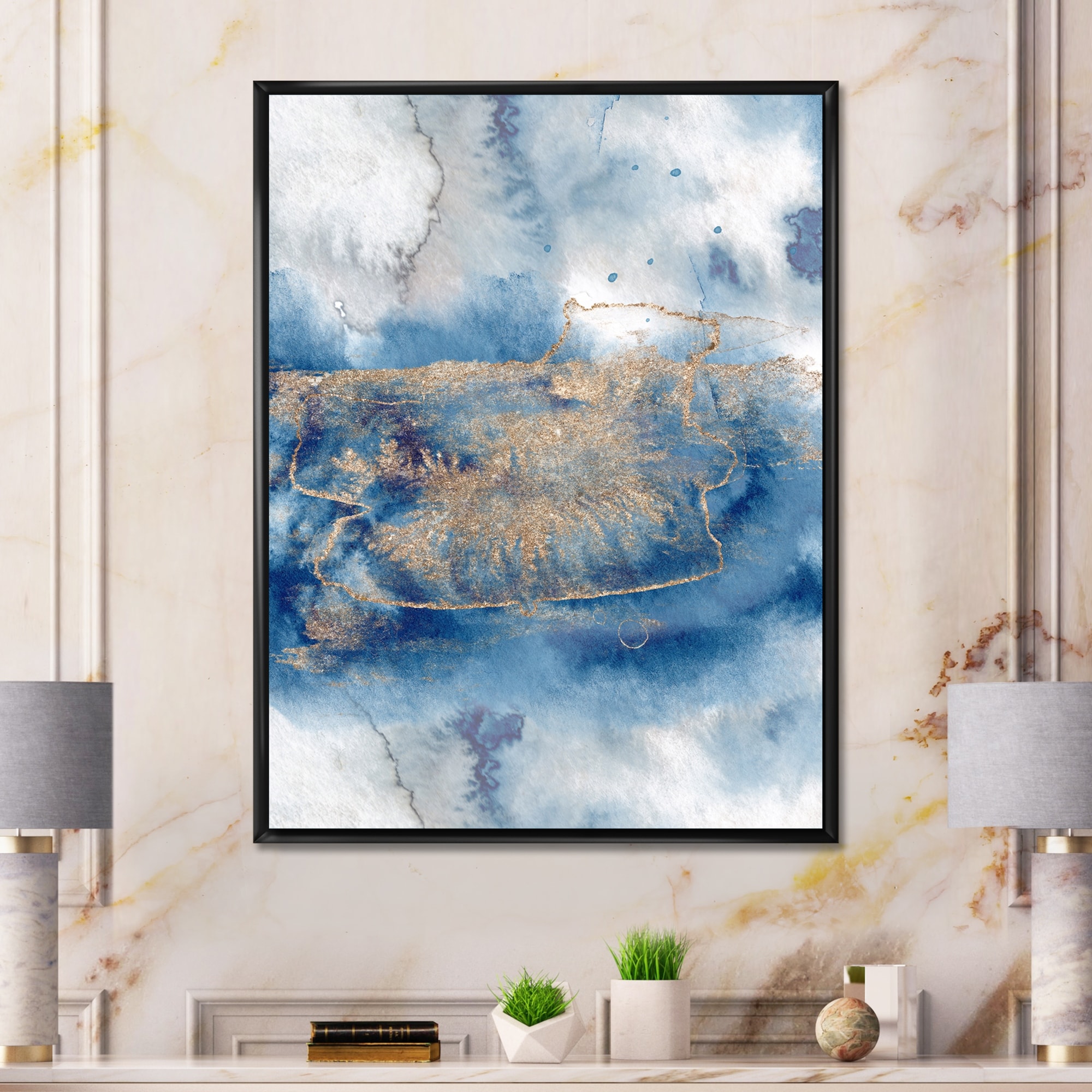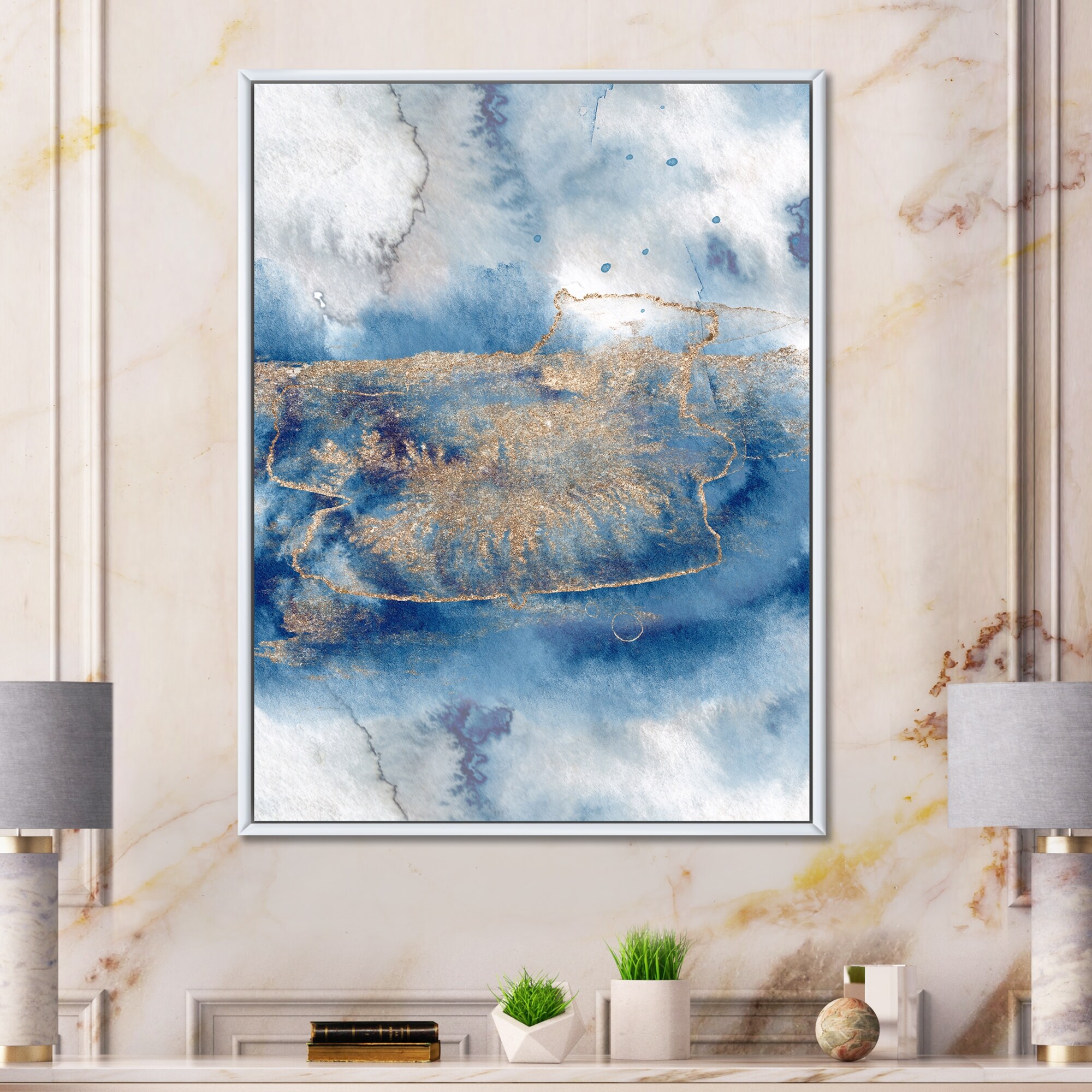 Designart "Marble Landscape in White Blue And Gold I" Modern Framed Canvas Wall Art Print
