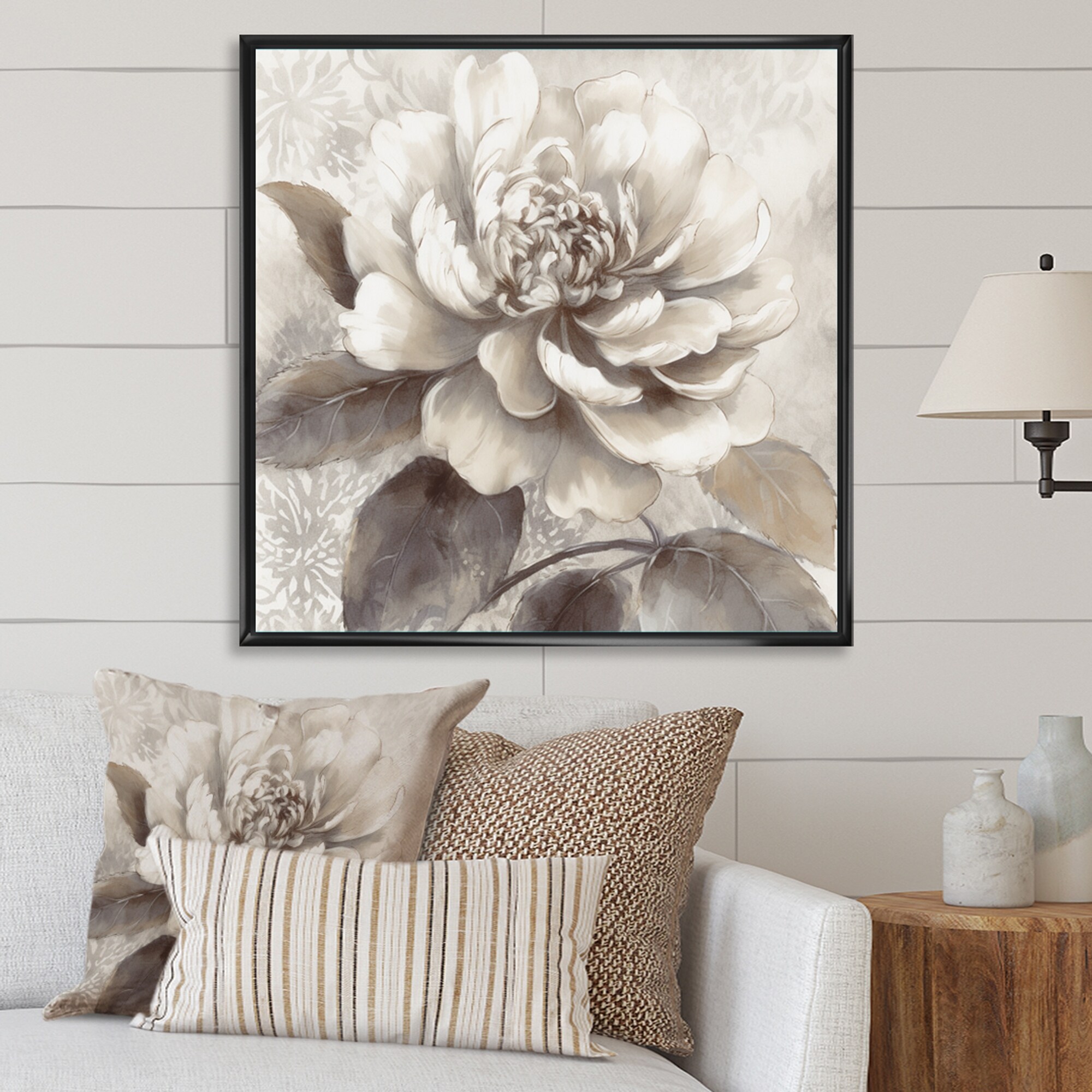 Designart "Grey Peonies on Branch Ii" Floral Peony Framed Wall Art for Living Room