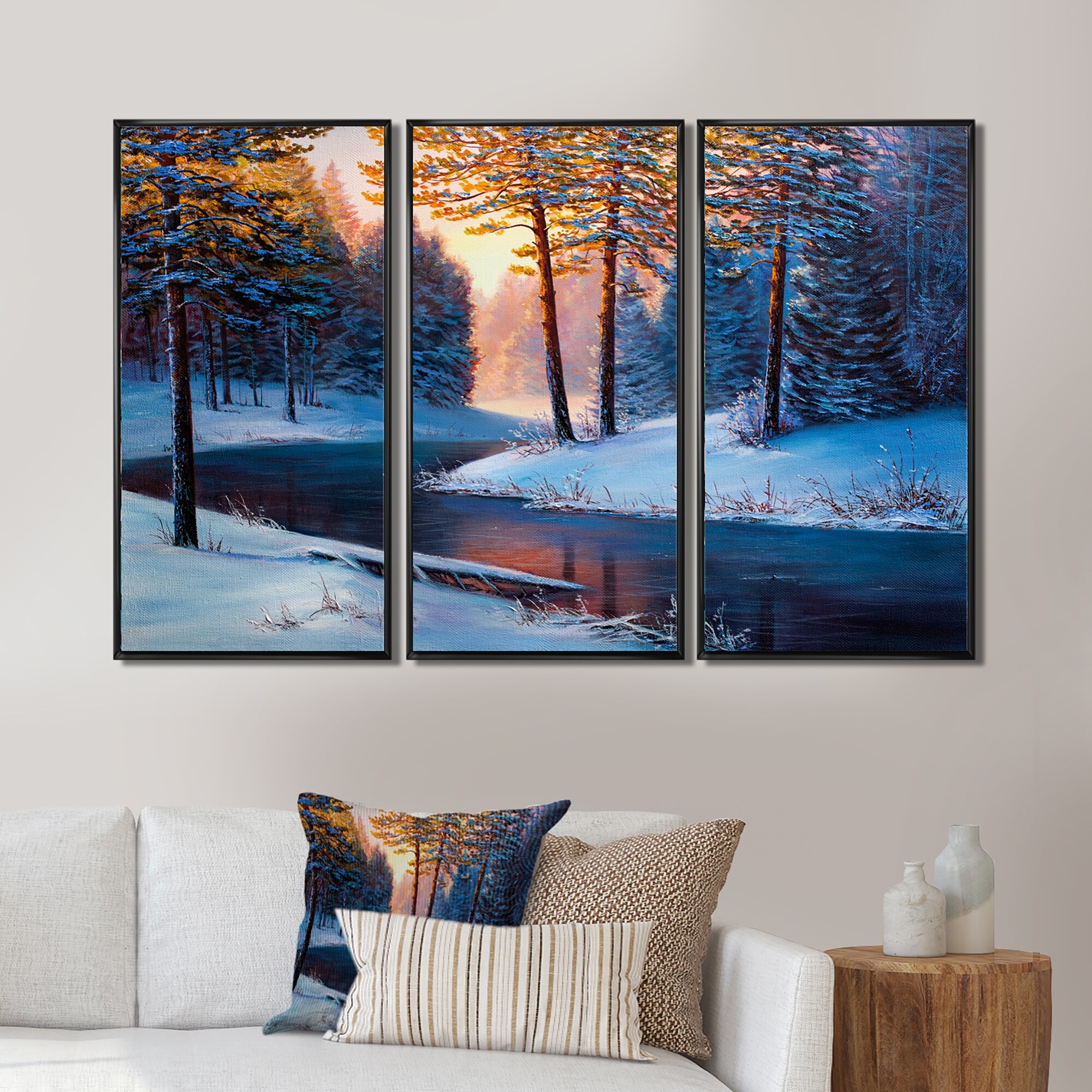 Designart "Sunshine Through the Christmas Forest By the River" Lake House Framed Wall Art Set of 3 - 4 Colors of Frames