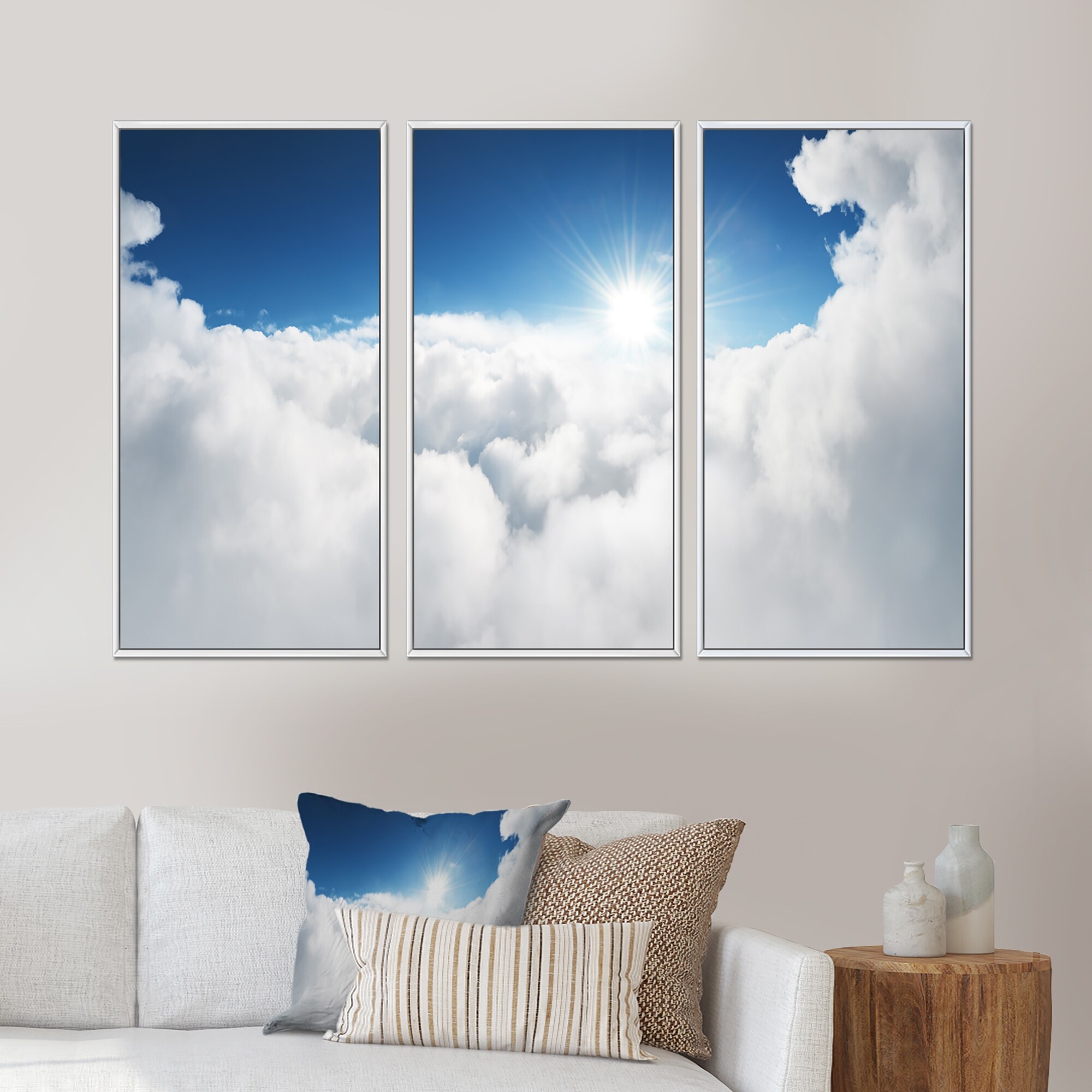 Designart "Blue Sky and Sun over Clouds" Landscape Framed Wall Art Set of 3 - 4 Colors of Frames