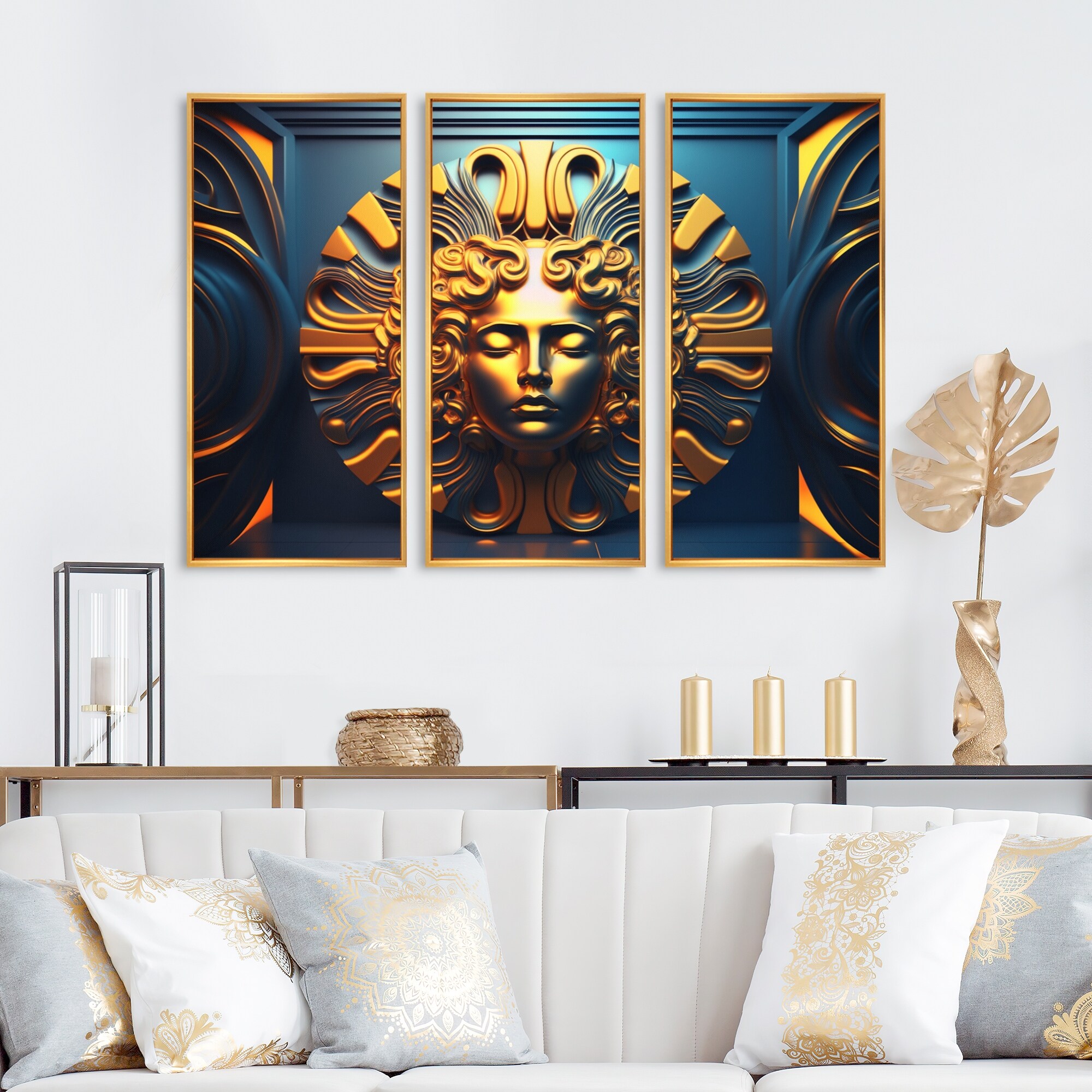 Designart "Classical Golden Goddess Woman" Modern Woman Framed Canvas Wall Art Print - 3 Panels