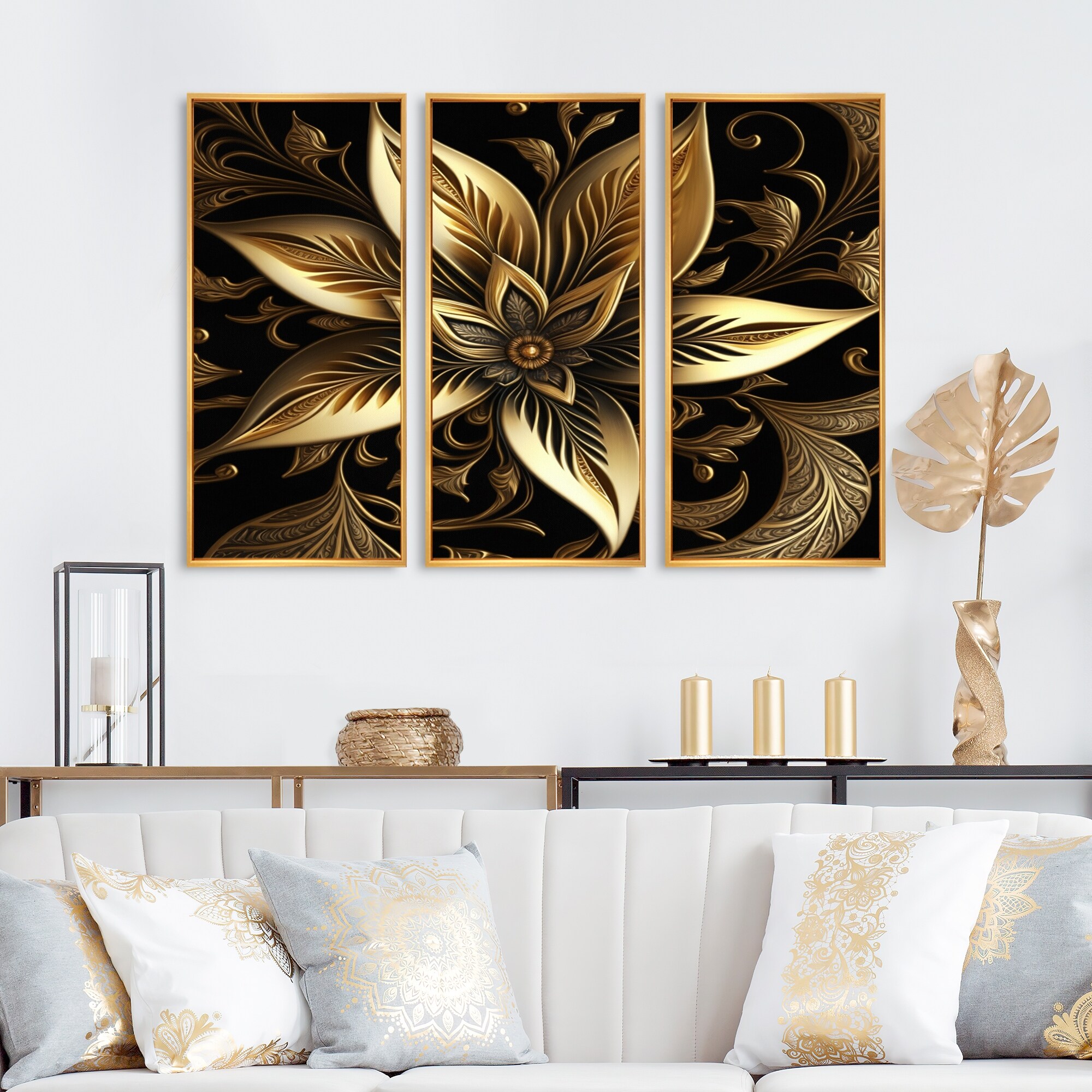 Designart "Lily Gold III" Floral Lily Framed Canvas Wall Art Print - 3 Panels