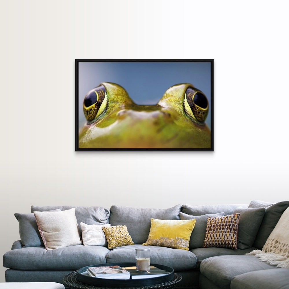 "Close up of bulging eyes of American Bullfrog." Black Float Frame Canvas Art