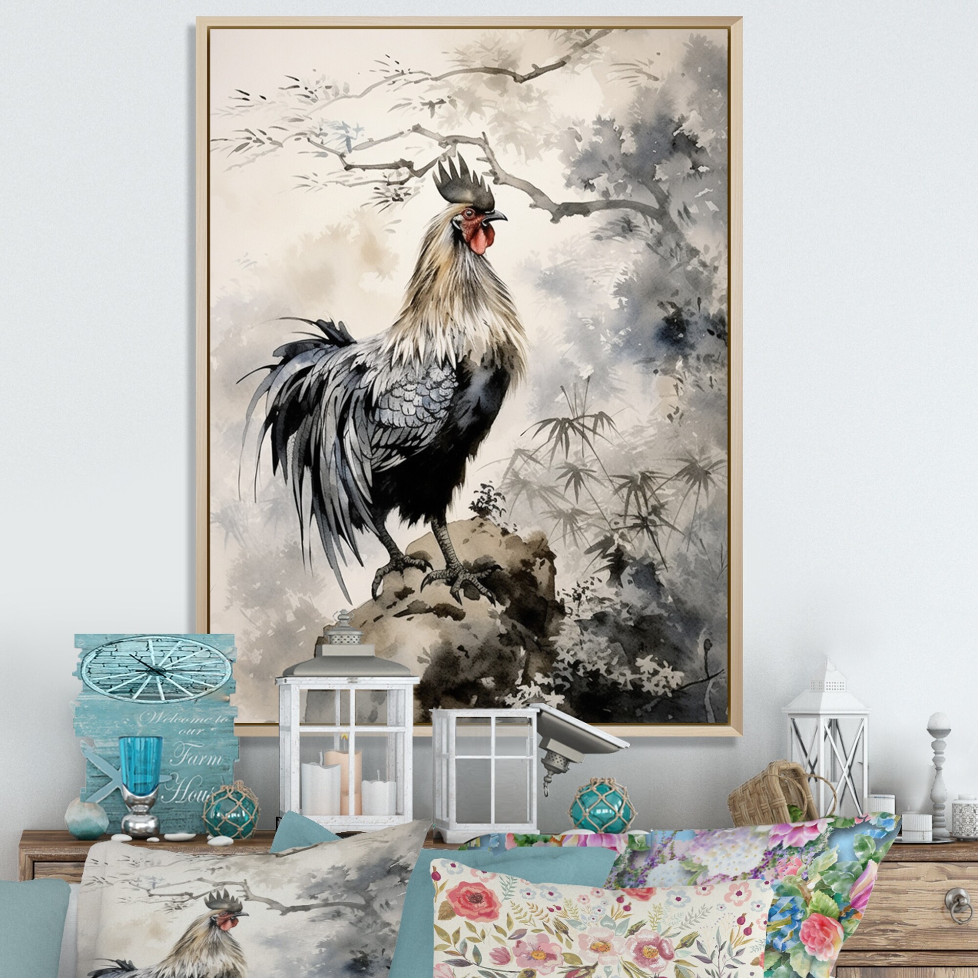 Designart "Asian Art Rooster Sumi I" Asian Art Framed Canvas Print