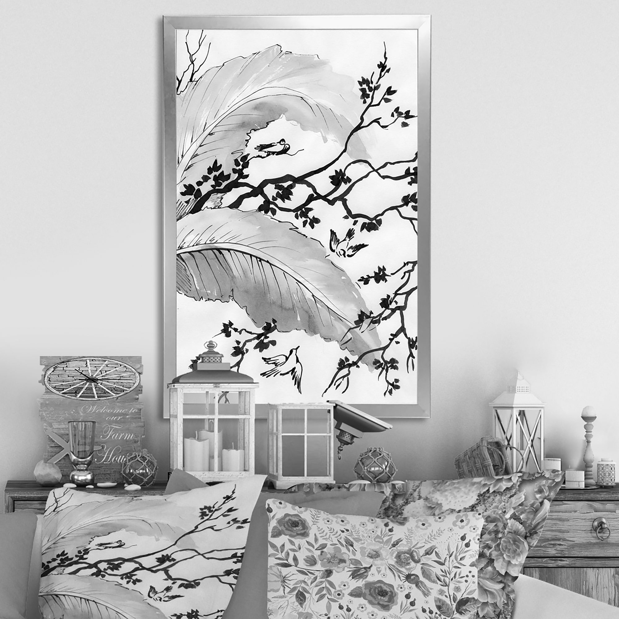 Designart "Asian Sketch of Nature Birds" Traditional Framed Wall Art