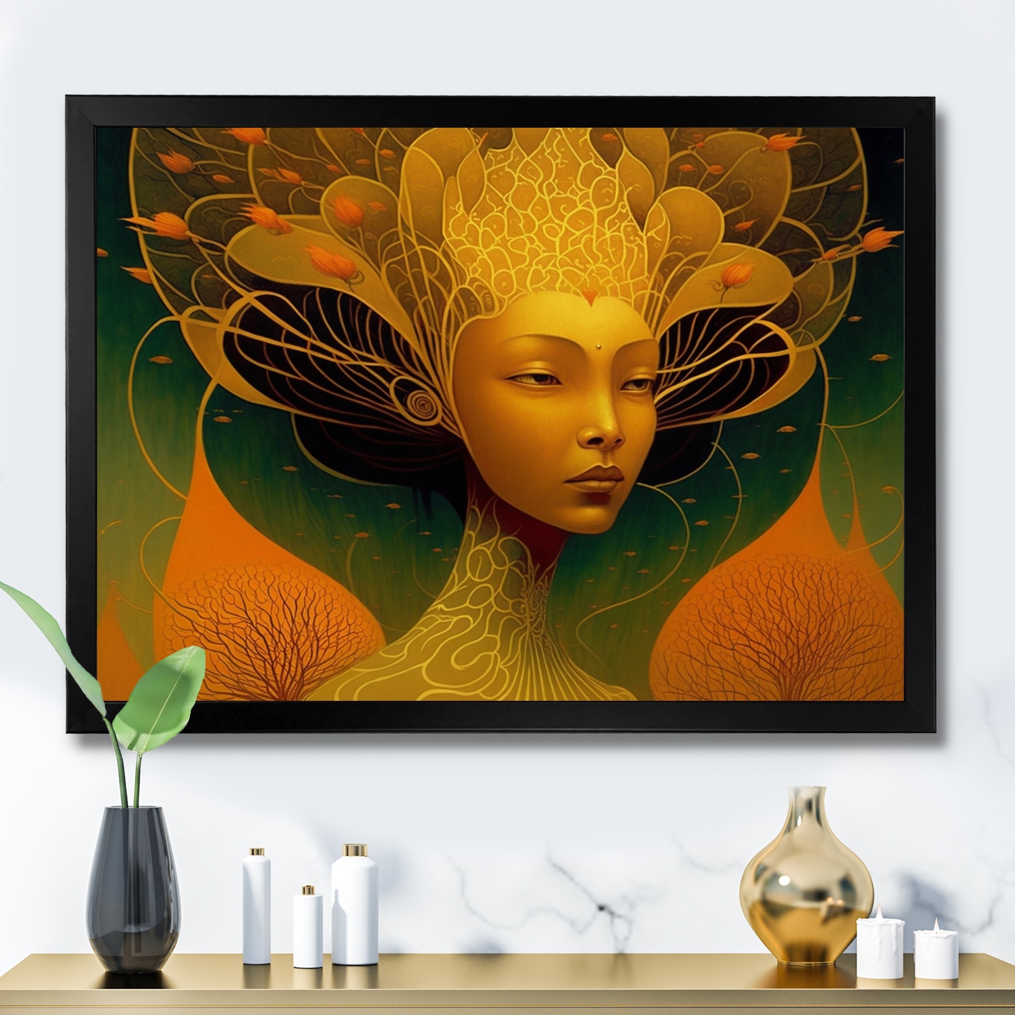 Designart "Gold And Black Floral Asian Woman II" Contemporary Glam Framed Canvas Art Print