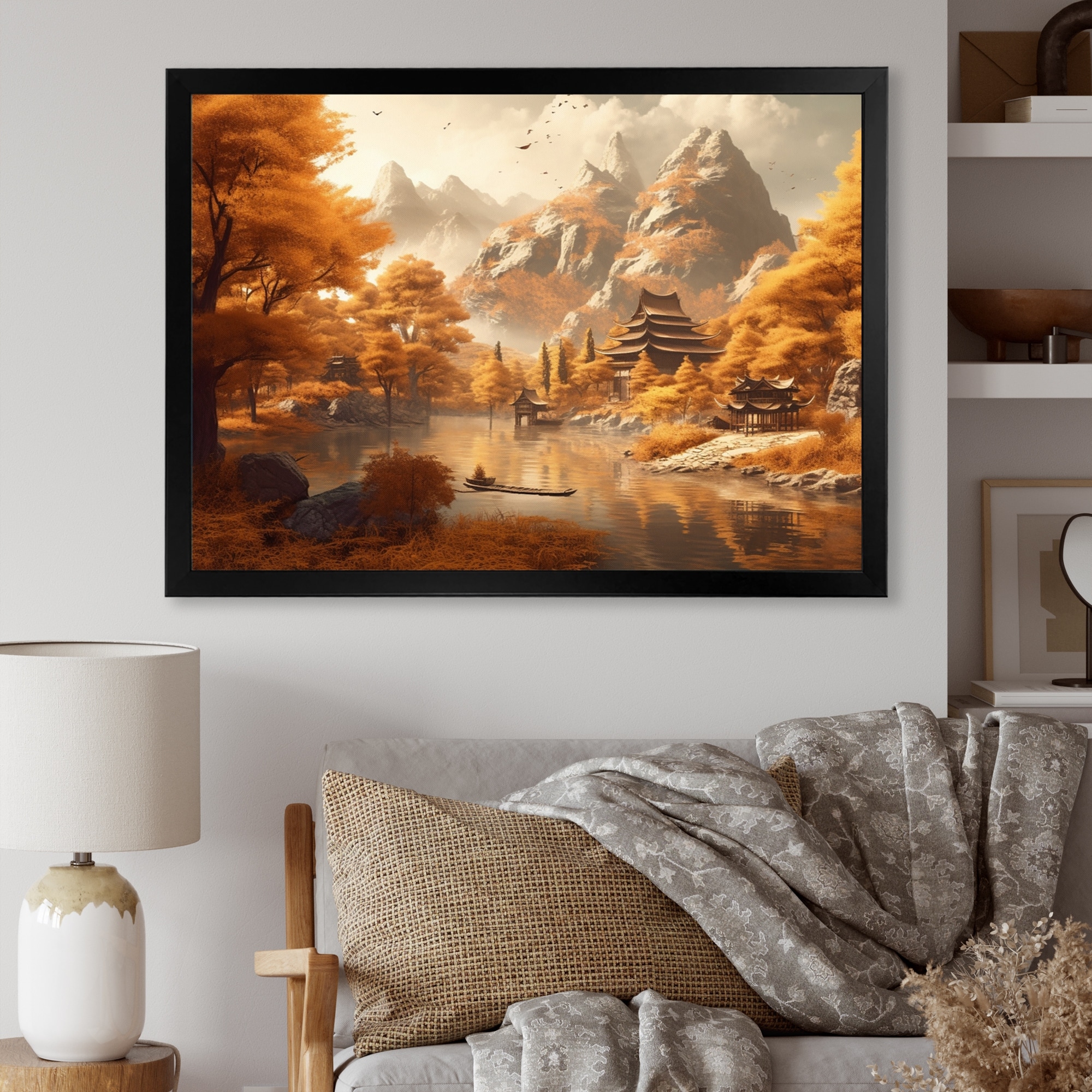 Designart "Asian Mountain And Lake Illustration I" Japon Landscape Framed Canvas Art Print